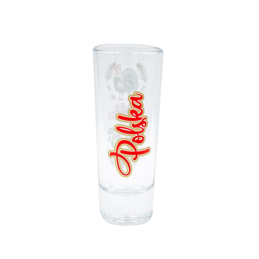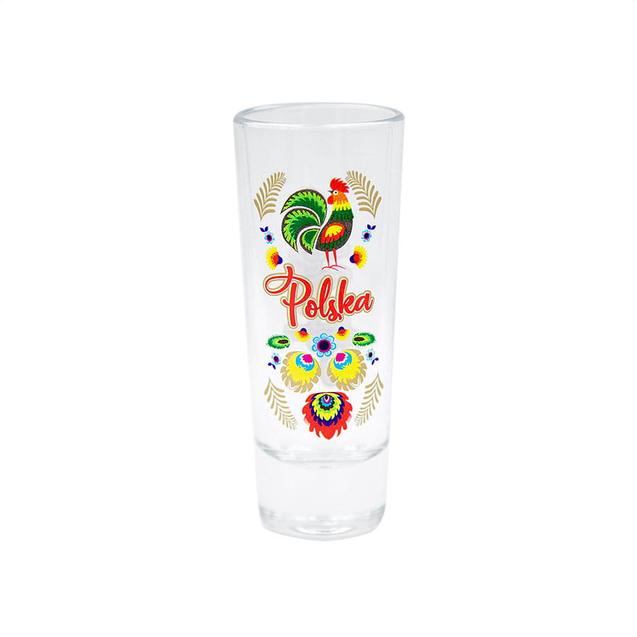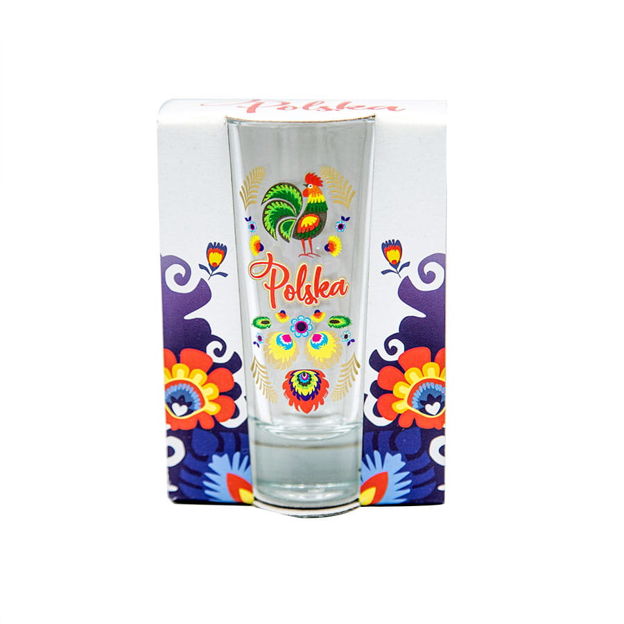 Kieliszek z grubego szkła, bardzo ładnie ozdobiony wzorem folkowym w barwach Łowickich.