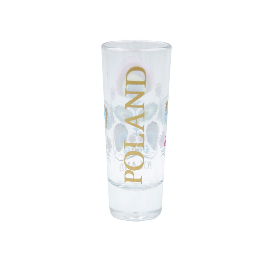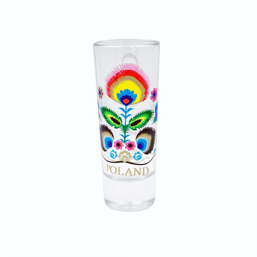 Kieliszek z grubego szkła, bardzo ładnie ozdobiony wzorem folkowym w barwach Łowickich. Nadruk dookoła kieliszka wykończony złotym napisem.