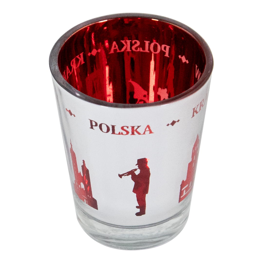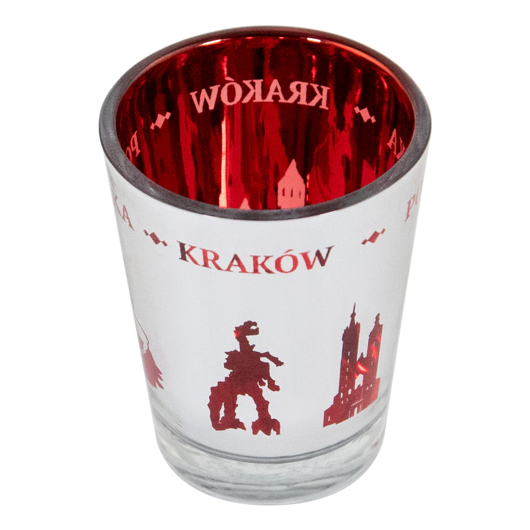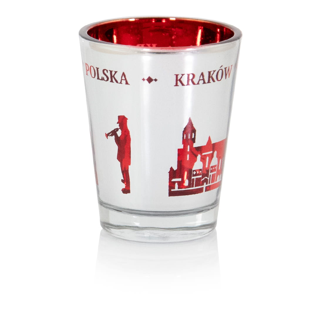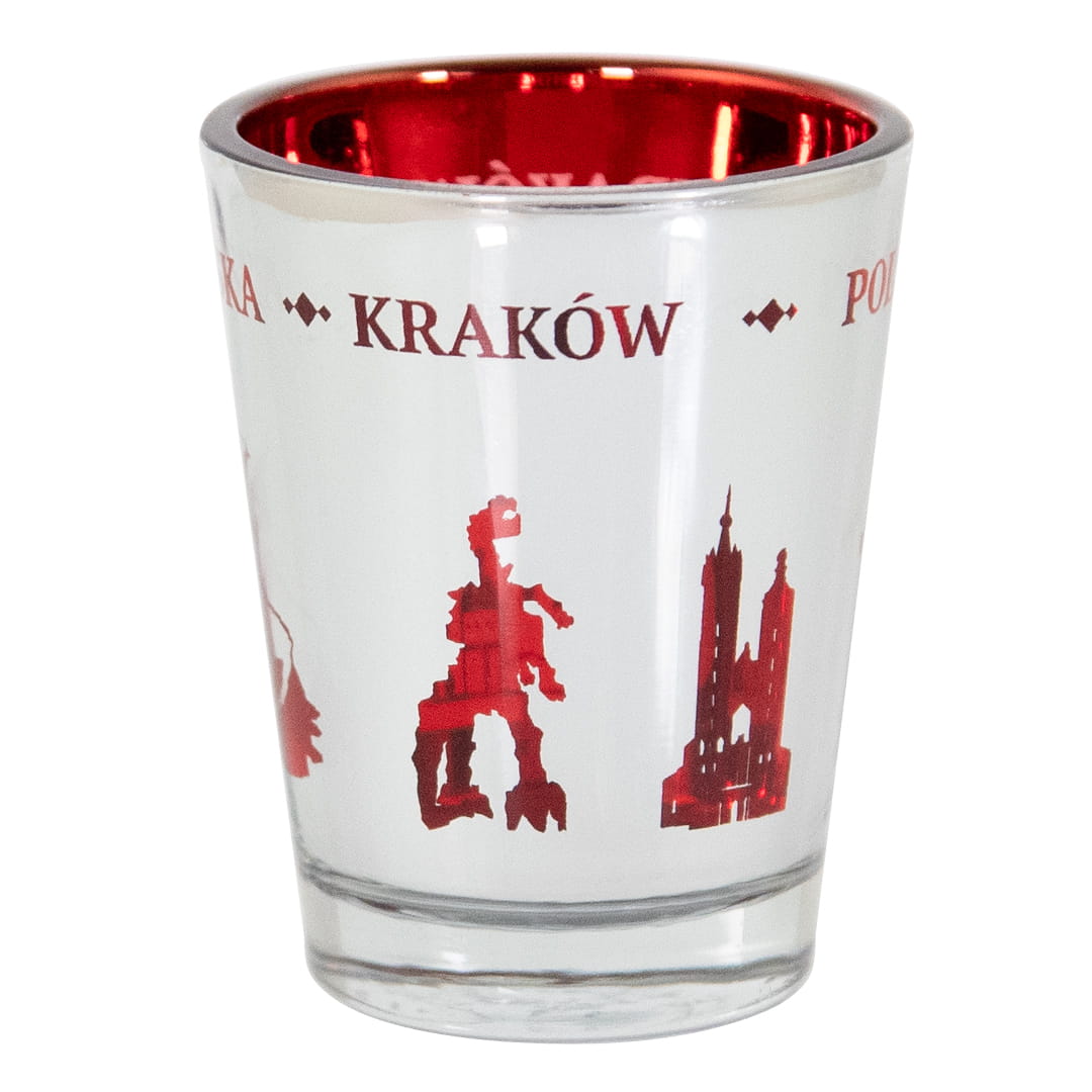 Wyjątkowy kieliszek wykonany ze szkła. Wnętrze kieliszka jest czerwone, a zewnętrzną cześć pokryta lustrzana powłoka z wyciętymi kształtami zabytków miasta co daje niesamowity lustrzano-czerwony efekt, którego częścią stały są również napisy Polska i Kraków.