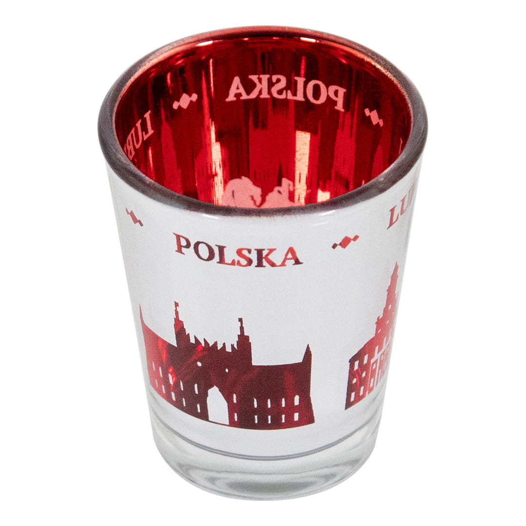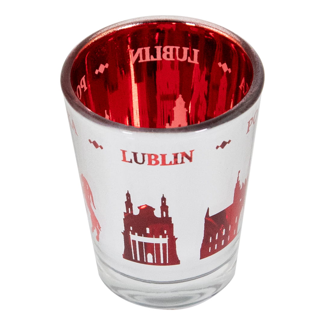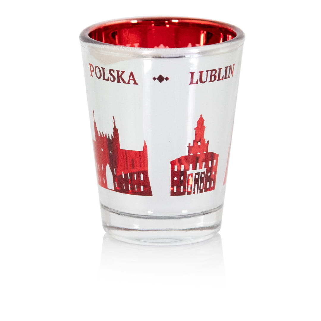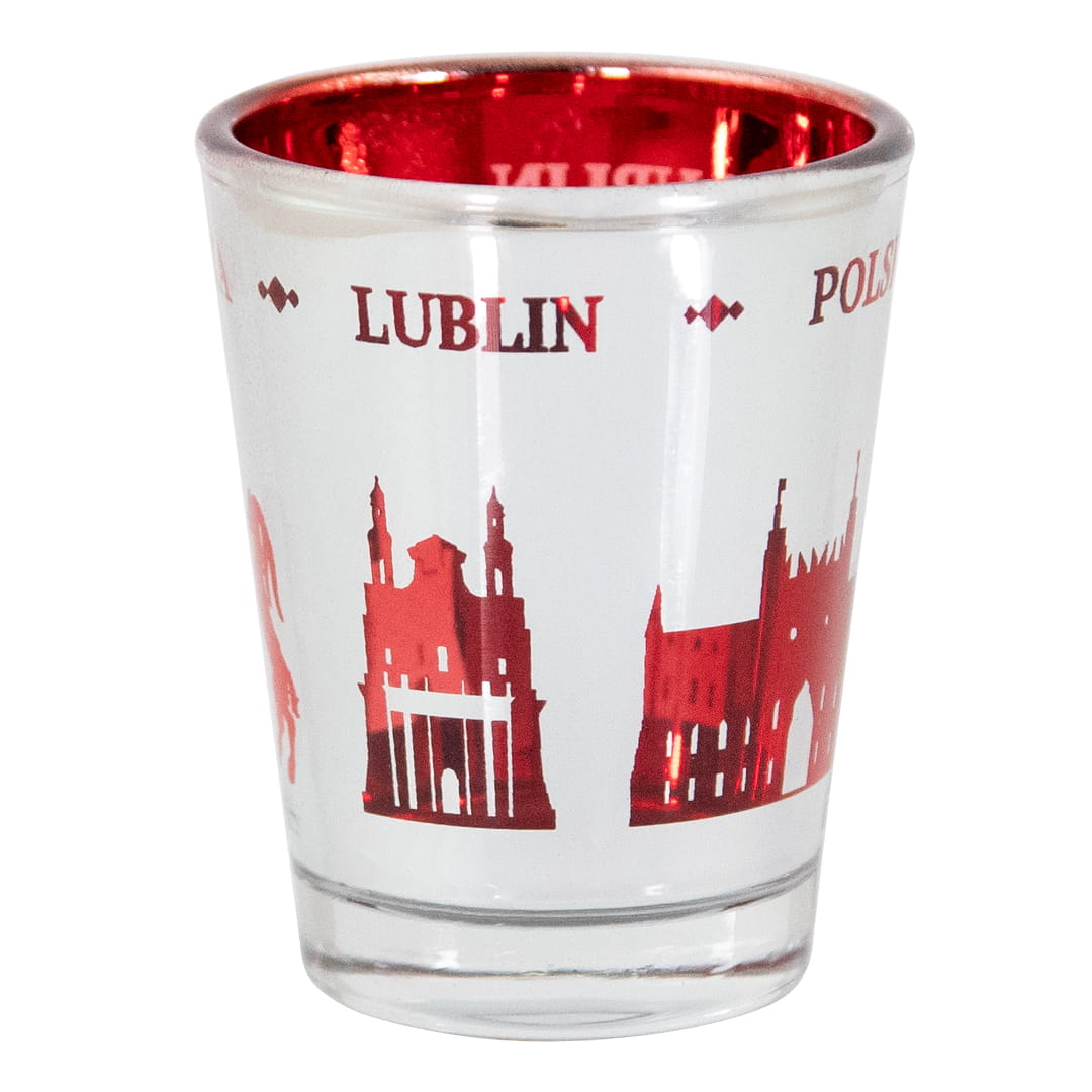 Wyjątkowy kieliszek wykonany ze szkła. Wnętrze kieliszka jest czerwone, a zewnętrzną cześć pokryta lustrzana powłoka z wyciętymi kształtami zabytków miasta co daje niesamowity lustrzano-czerwony efekt, którego częścią stały są również napisy Polska i Lublin.