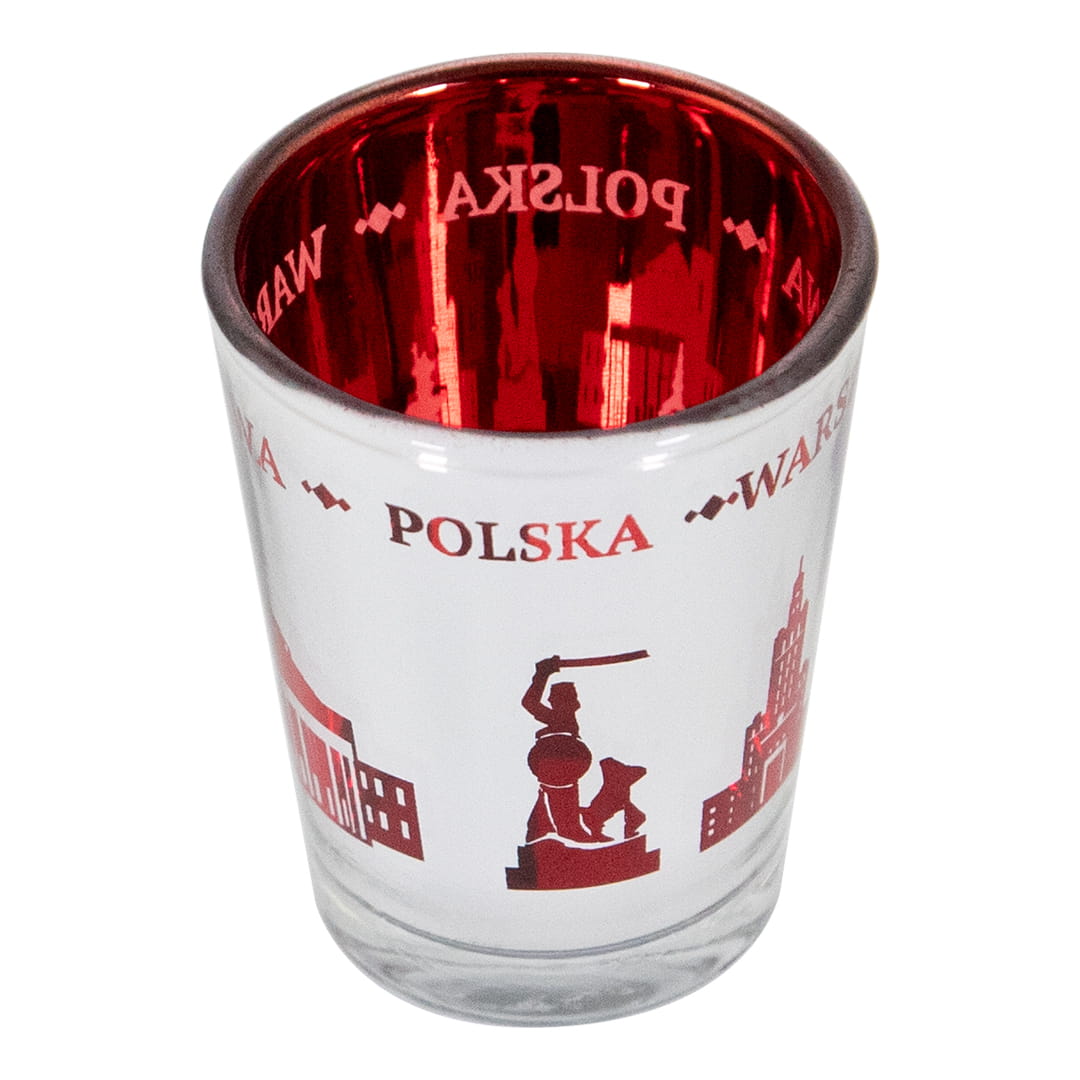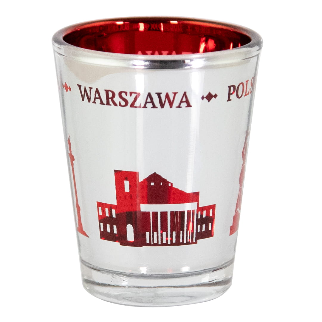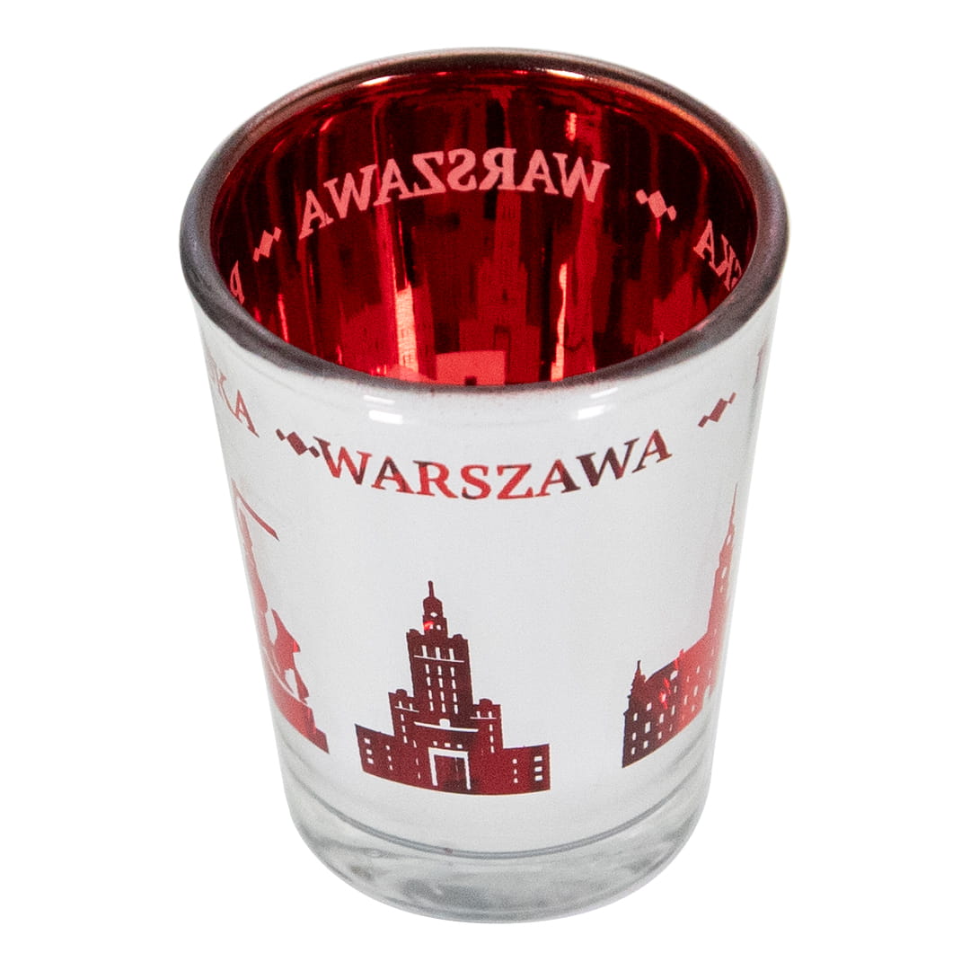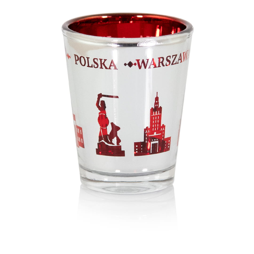 Wyjątkowy kieliszek wykonany ze szkła. Wnętrze kieliszka jest czerwone, a zewnętrzną cześć pokryta lustrzana powłoka z wyciętymi kształtami zabytków miasta co daje niesamowity lustrzano-czerwony efekt, którego częścią stały są również napisy Polska i Warszawa.