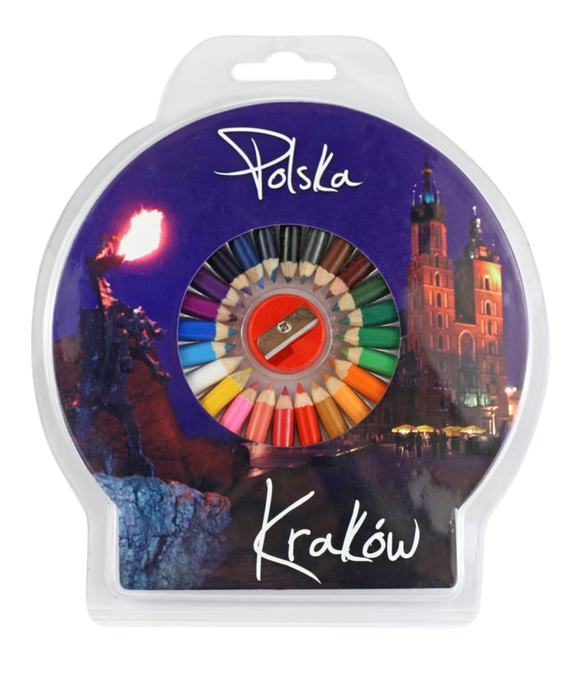 Drewniane okrągłe kredki ołówkowe w bogatej palecie barw. W opakowaniu znajdują się 24 kredki w różnych kolorach oraz okrągła temperówka. Na opakowaniu znajduje się zdjęcie z widokiem na kościół Mariacki i smok ziejący ogniem oraz napisy "Polska" i "Kraków".