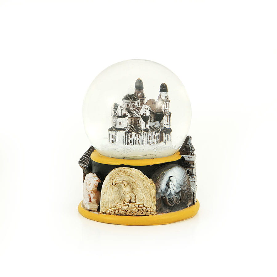 Ręcznie malowana kula śniegowa z zawartą we wnętrzu figurką Chełmskiego ratusza. Jej zdobiona podstawa wykonana jest z polyresinu. Widnieje na niej napis "Chełm". Sama kula w której znajduje się figurka wykonana została ze szkła.