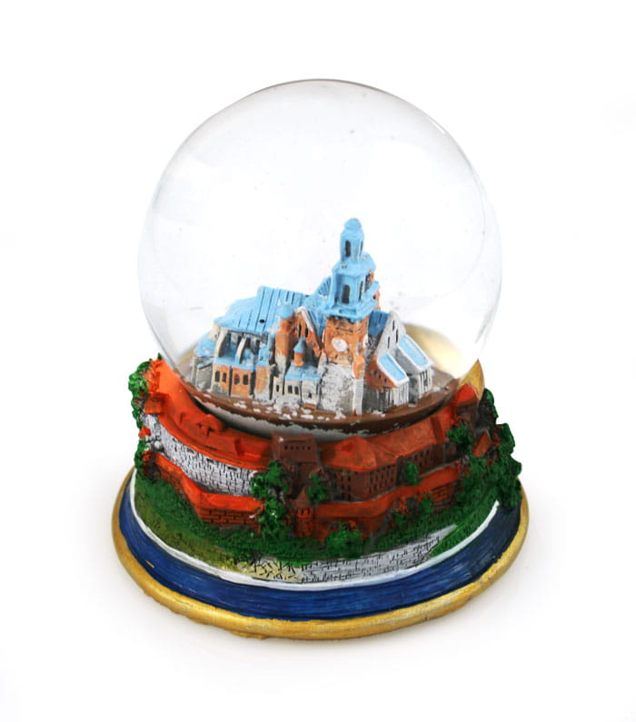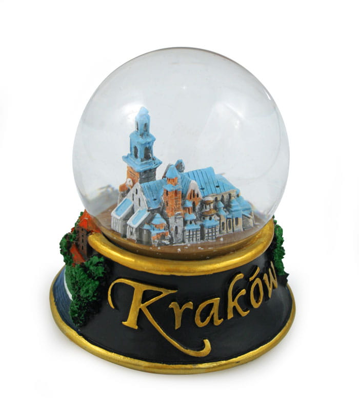 Ręcznie malowana kula śniegowa z zawartym we wnętrzu wizerunkiem katedry wawelskiej. Jej zdobiona podstawa wykonana jest z polyresinu. Widnieje na niej widok na Wawel i napis "Kraków". Sama kula w której znajduje się figurka wykonana została ze szkła.