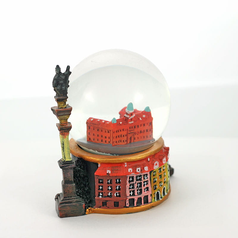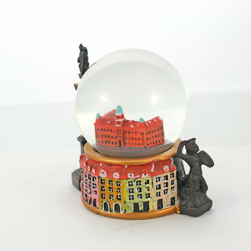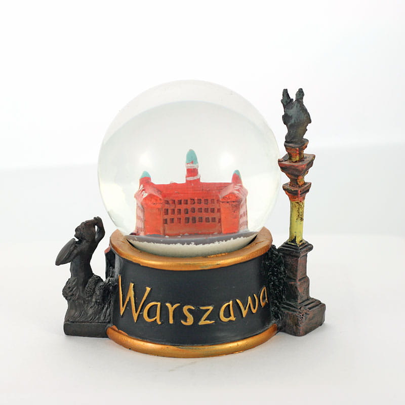 Ręcznie malowana kula śniegowa z zawartym we wnętrzu wizerunkiem warszawskiego Zamku Królewskiego. Jej zdobiona podstawa wykonana jest z polyresinu. Poza jej obrys wystaje figurka Syrenki i Kolumny Zygmunta. Widnieje na niej napis "Warszawa". Sama kula w której znajduje się figurka wykonana została ze szkła.
