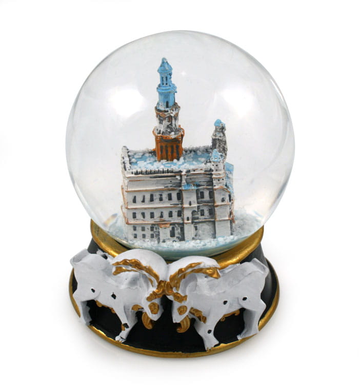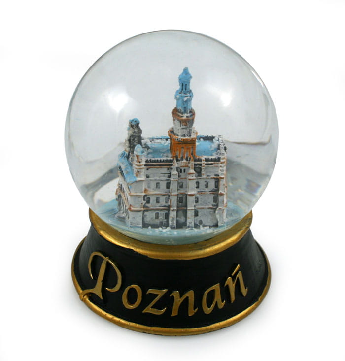 Ręcznie malowana kula śniegowa z zawartym we wnętrzu wizerunkiem poznańskiego ratusza. Jej zdobiona podstawa wykonana jest z polyresinu. Znajdują się na niej napis koziołki i napis "Poznań". Sama kula w której znajduje się figurka wykonana została ze szkła.