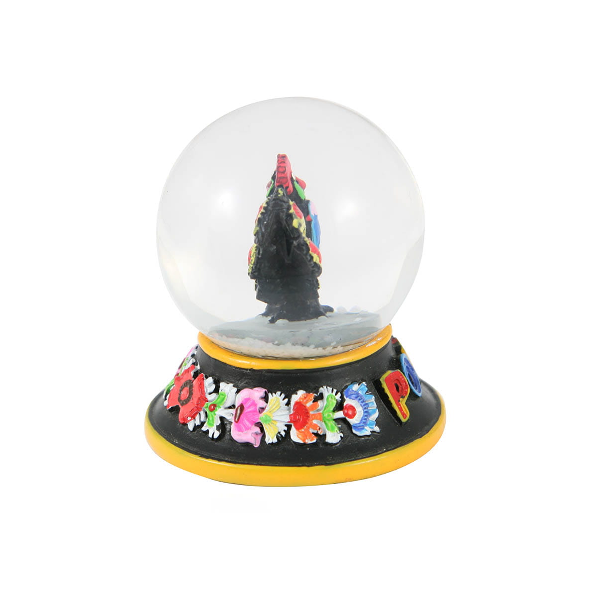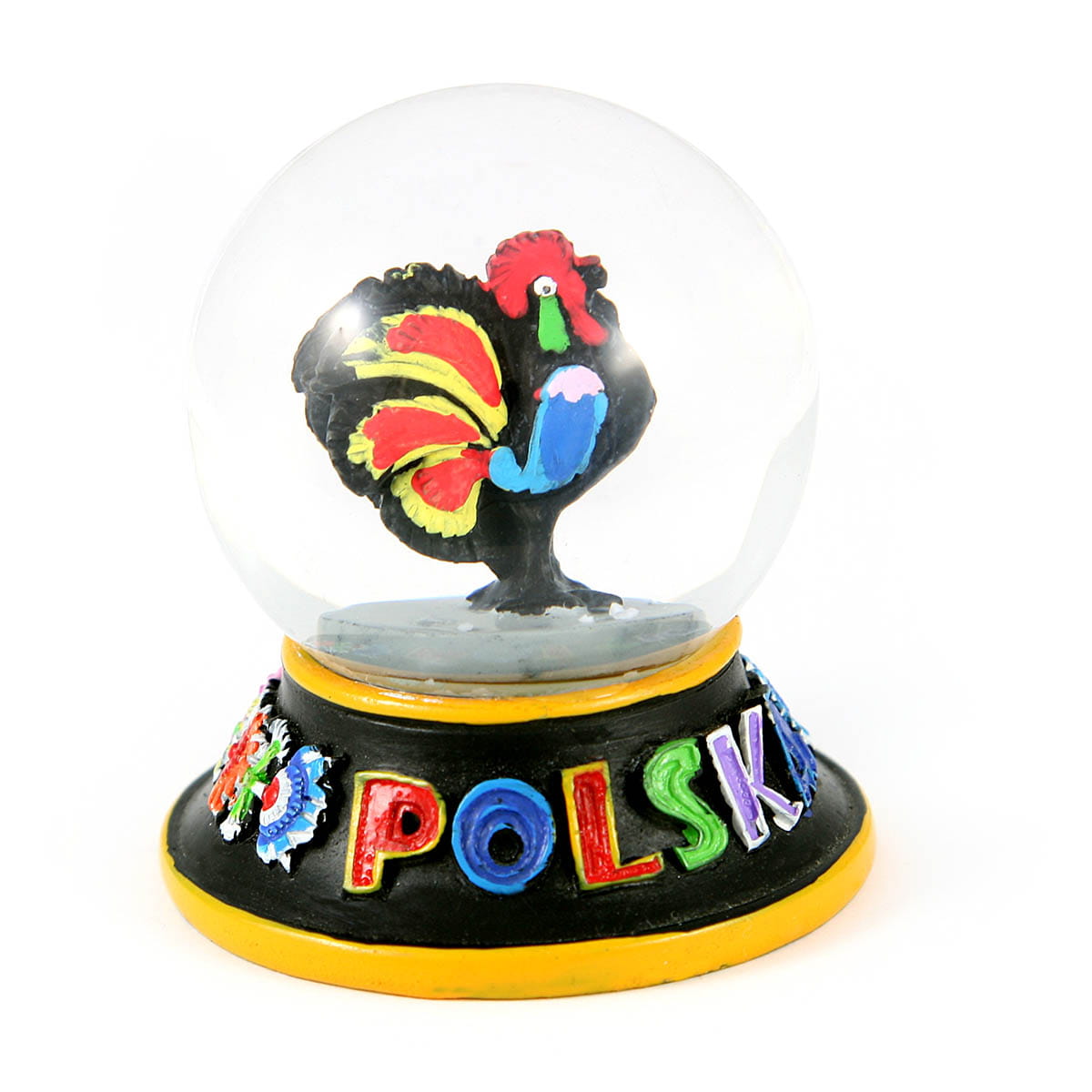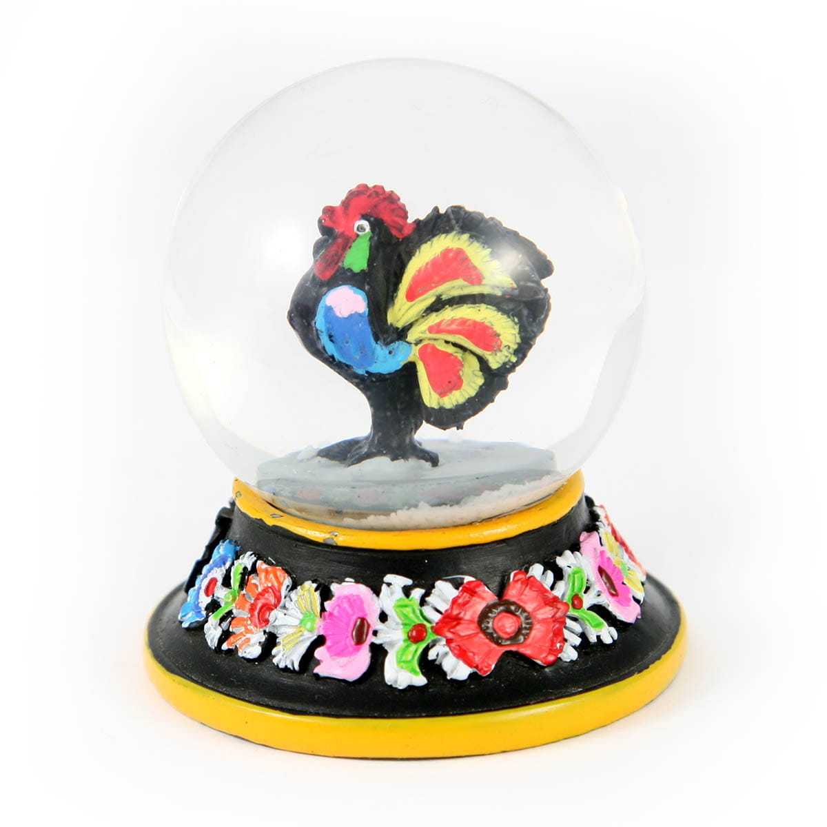 Ręcznie malowana kula śniegowa z zawartym we wnętrzu łowickim kogucikiem. Jej podstawa wykonana jest ze zdobionego polyresinu. Sama kula, w której umieszczona jest figurka, wykonana została ze szkła.
