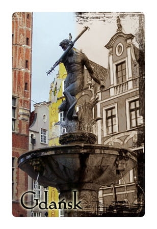 Magnes wykonany z folii magnetycznej. Nadruk na folii składa się z dwóch widoków na pomnik Neptuna - jeden w sepii, a drugi kolorowy. Fotografie te zmieniają się / przenikają się w trakcie poruszania magnesem. Na magnesie widoczny jest też wyraźny napis "Gdańsk".