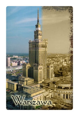 Magnes wykonany z folii magnetycznej. Nadruk na folii składa się z dwóch widoków na warszawski Pałac Kultury - jeden w sepii, a drugi kolorowy. Fotografie te zmieniają się / przenikają się w trakcie poruszania magnesem. Na magnesie widoczny jest też wyraźny napis "Warszawa".