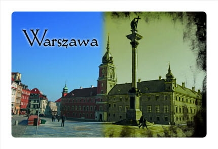 Magnes wykonany z folii magnetycznej. Nadruk na folii składa się z dwóch widoków na Zamek Królewski w Warszawie - jeden w sepii, a drugi kolorowy. Fotografie te zmieniają się / przenikają się w trakcie poruszania magnesem. Na magnesie widoczny jest też wyraźny napis "Warszawa".
