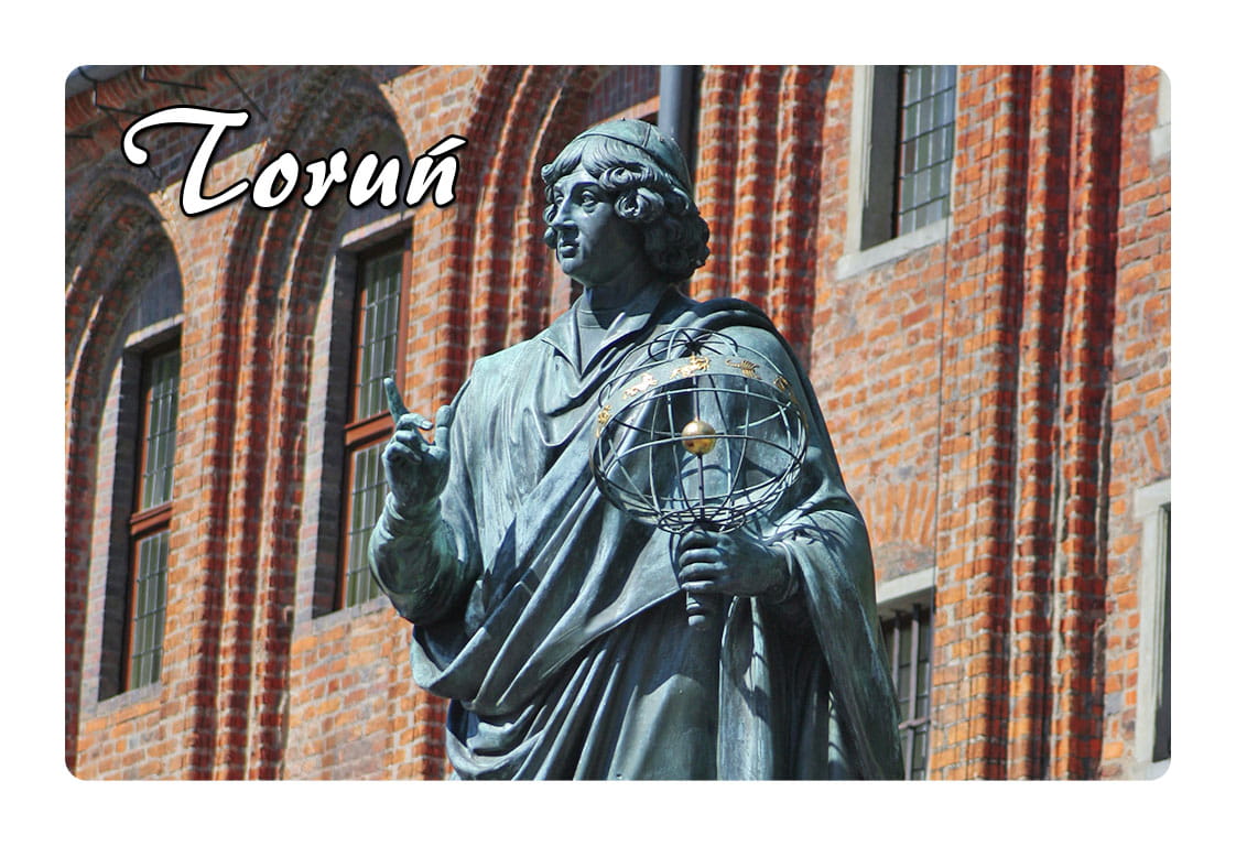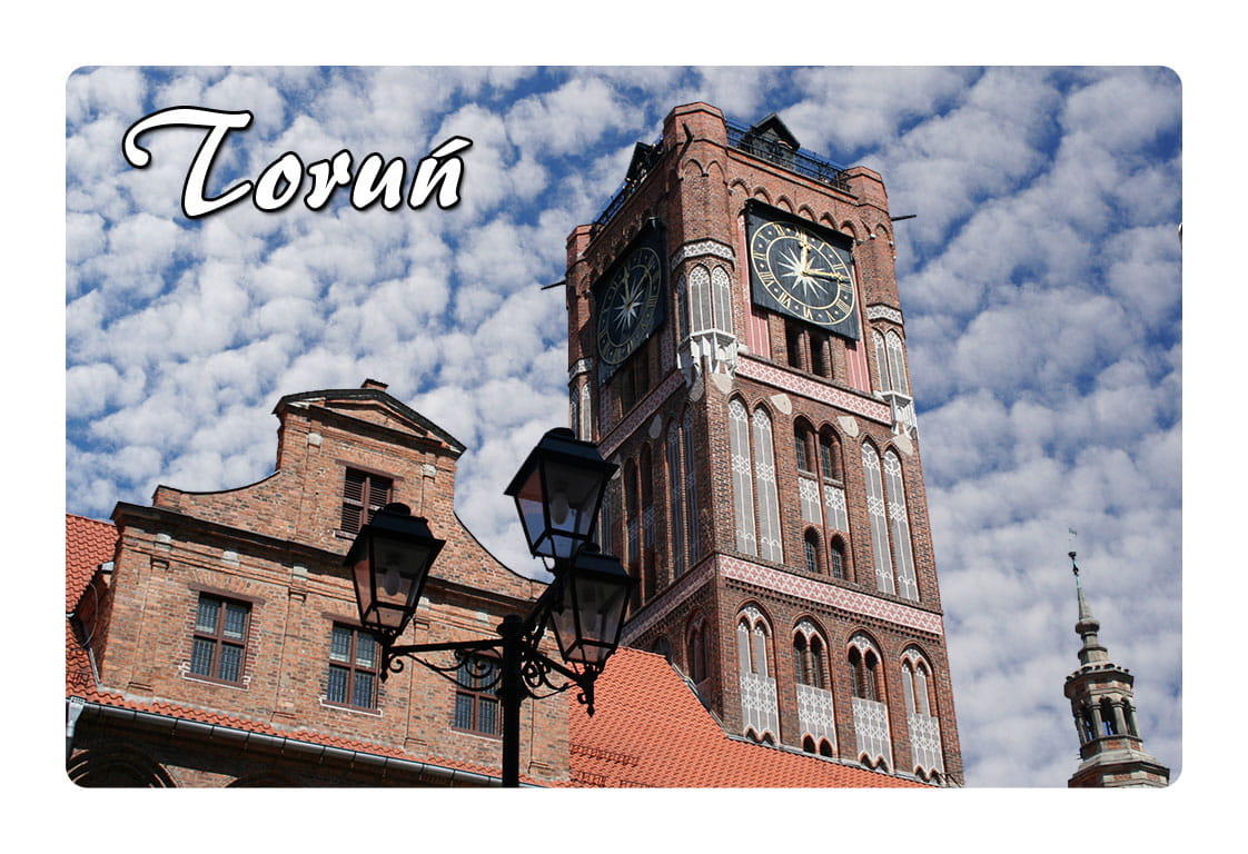 Magnes wykonany z folii magnetycznej. Nadruk na folii składa się z przenikających się zdjęć Torunia. Fotografie te zmieniają się / przenikają się w trakcie poruszania magnesem. Na magnesie widoczny jest też wyraźny napis "Toruń".