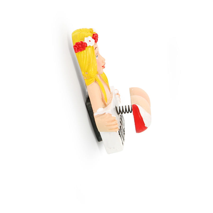 Zabawny, polyresinowy magnes przedstawiający słowiankę z dużym biustem trzymającą tabliczkę z napisem "Polska". Biust słowianki zamocowany jest na sprężynce.