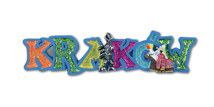 Wielokolorowy, brokatowy, ręcznie malowany magnes w kształcie napisu "Kraków" z motywem Smoka i Lajkonika.