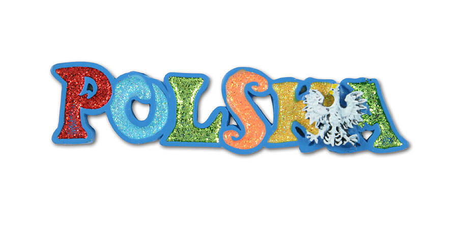 Wielokolorowy, brokatowy, ręcznie malowany magnes w kształcie napisu "Polska" z motywem orła w koronie.