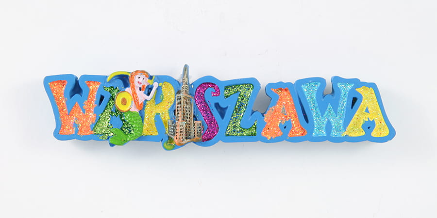Wielokolorowy, brokatowy, ręcznie malowany magnes w kształcie napisu "Warszawa" z motywem Warszawskiej Syrenki i Pałacu Kultury i Nauki.