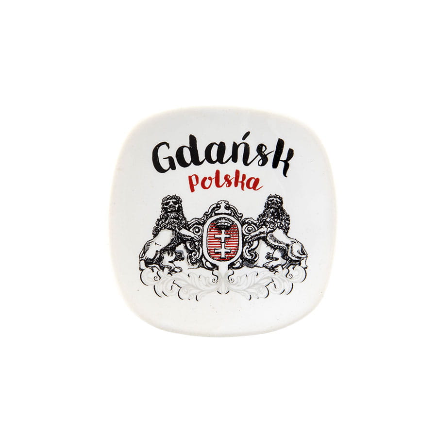 Ceramiczny magnes prezentujący symboliczny szkic herbu Gdańska wraz z napisami "Gdańsk", "Polska".