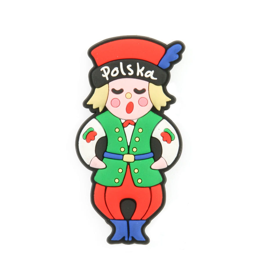 Gumowy magnes w kształcie chłopca ubranego w strój ludowy. Na czapce widnieje napis "Polska".