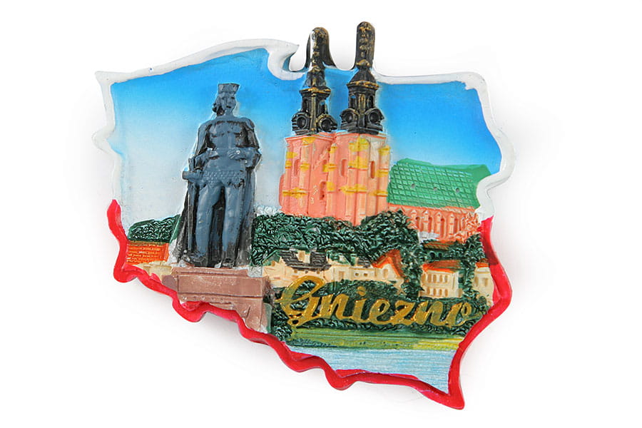 Kolorowy, ręcznie malowany magnes przedstawiający pomnik Bolesława Chrobrego oraz widok na Katedrę Gnieźnieńską od strony jeziora Jelonek.