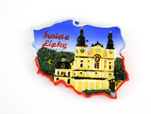 Ręcznie malowany magnes w kształci granic Polski, wykonany z tworzywa będącego mieszaniną żywiczną. Posiada wypukłą strukturę i cechuje się dużą ilością detali.