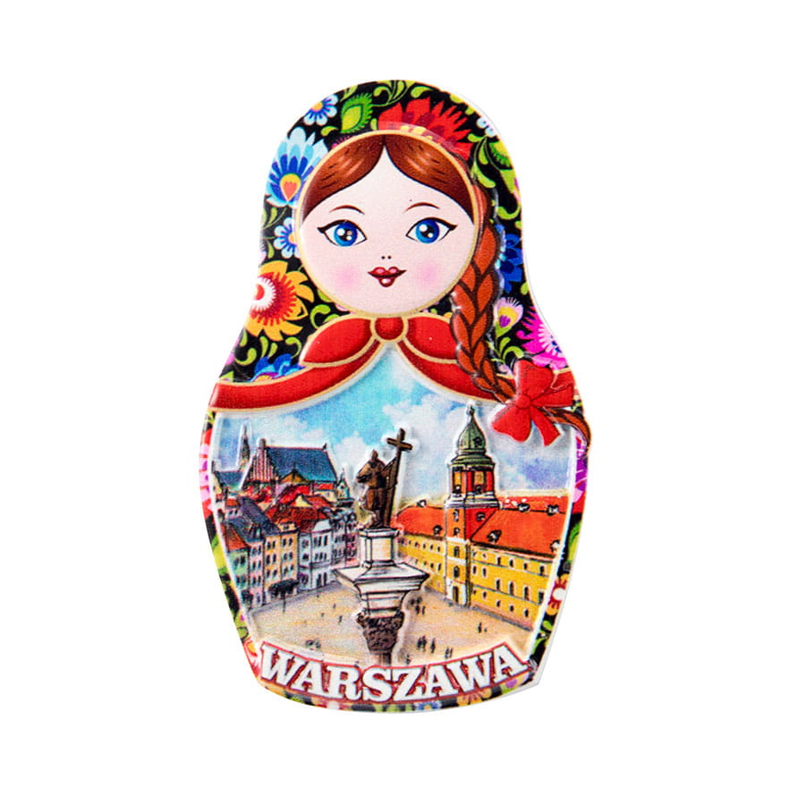 Polyresinowy, wielokolorowy magnes w kształcie Matrioszki z obrazem przedstawiającym warszawską Kolumnę Zygmunta wraz z podpisem "Warszawa".