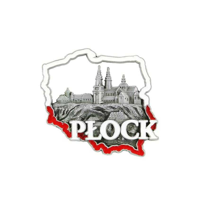 Metalowy, elegancki, bogato zdobiony odlewany magnes w kształcie konturu Polski. W jej wnętrzu znajduje się wizerunek Wzgórza Tumskiego oraz duży, wyraźny napis "Płock". Kontur Polski pomalowany jest na biało-czerwono, napis na biało, natomiast wnętrze mapy pozostawiono w kolorze antycznym srebrnym.