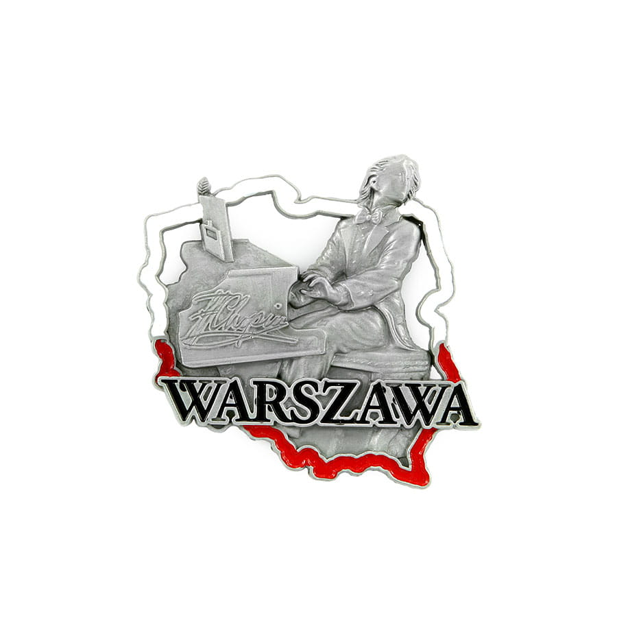 Metalowy, elegancki, bogato zdobiony odlewany magnes w kształcie konturu Polski. W jej wnętrzu znajduje się wizerunek Fryderyka Chopina grającego na fortepianie oraz duży, wyraźny napis "Warszawa". Kontur Polski pomalowany jest na biało-czerwono, napis na czarno, natomiast wnętrze mapy pozostawiono w kolorze antycznym srebrnym.
