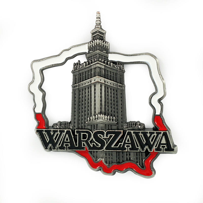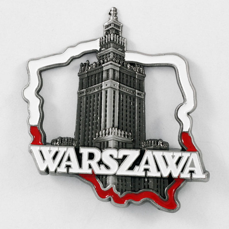 Metalowy, elegancki, bogato zdobiony odlewany magnes w kształcie konturu Polski. W jej wnętrzu znajduje się wizerunek Pałacu Kultury i Nauki oraz duży, wyraźny napis "Warszawa". Kontur Polski pomalowany jest na biało-czerwono, natomiast wnętrze mapy pozostawiono w kolorze antycznym srebrnym. Dostępny w dwóch wariantach: z czarnym lub białym napisem.
