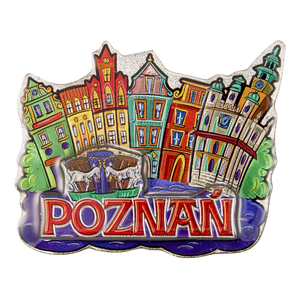 Kolorowy magnes, o charakterze komiksowym, karykaturalnym, wykonany z metalizowanego MDF. Przedstawia poznański rynek oraz koziołki i wyraźny napis "Poznań".