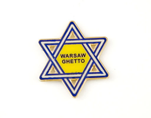 Metalowy magnes w kształcie gwiazdy Dawida w biało-niebieskich barwach. Środek gwiazdy w kolorze żółtym z napisem "Warsaw Ghetto".
