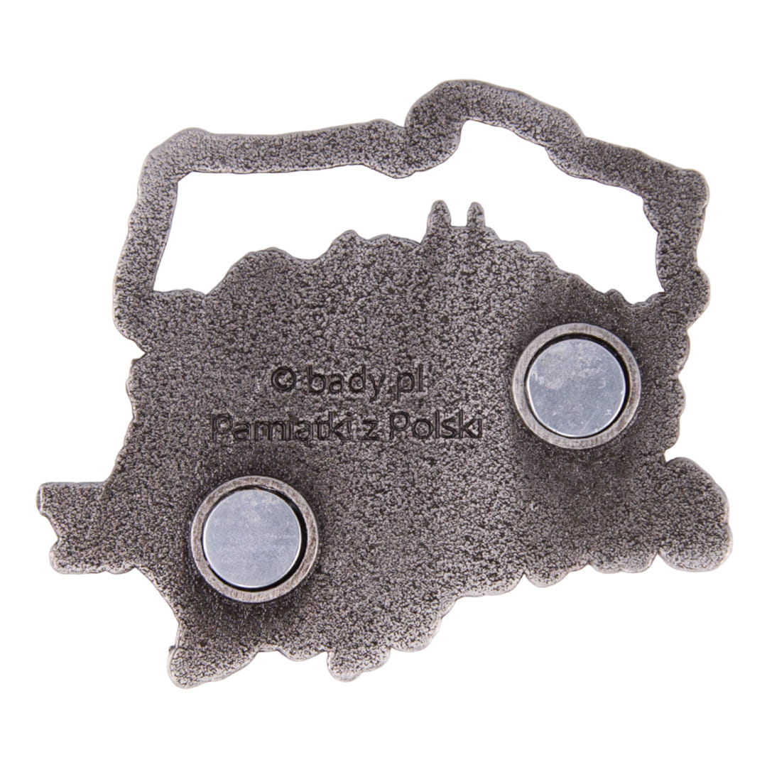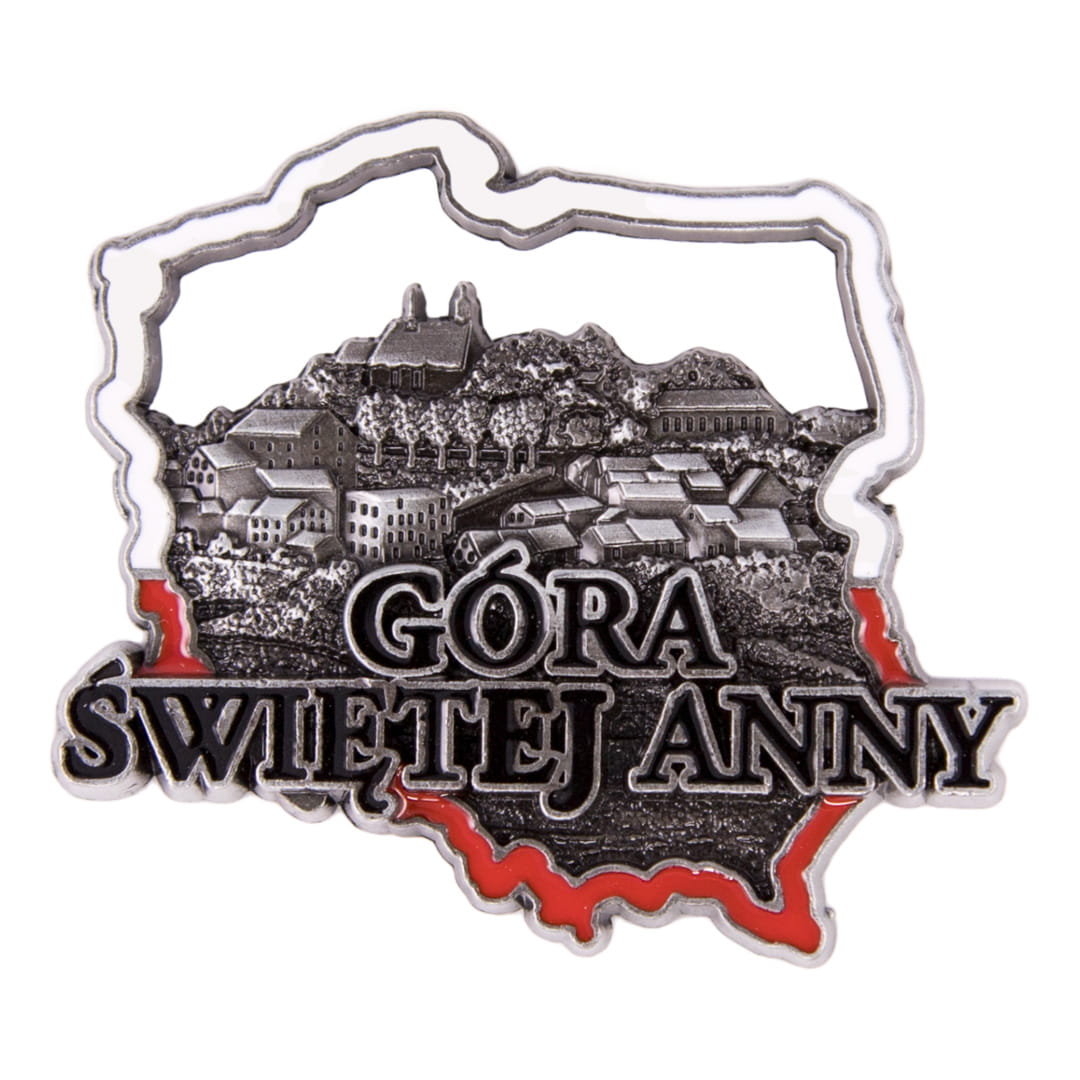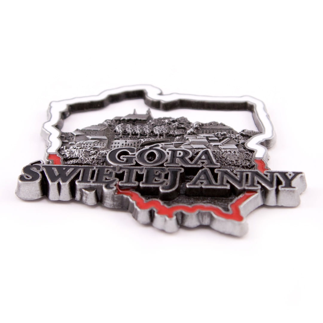 Metalowy, elegancki, bogato zdobiony, odlewany magnes w kształcie konturu Polski. W jej wnętrzu znajduje się panorama miasta oraz wyraźny napis "Góra Świętej Anny". Kontur Polski pomalowany jest na biało-czerwono, napis na czarno, natomiast wnętrze mapy pozostawiono w kolorze antycznym srebrnym.