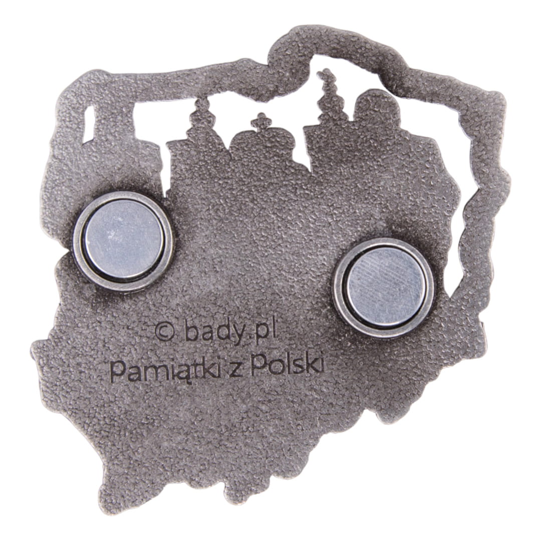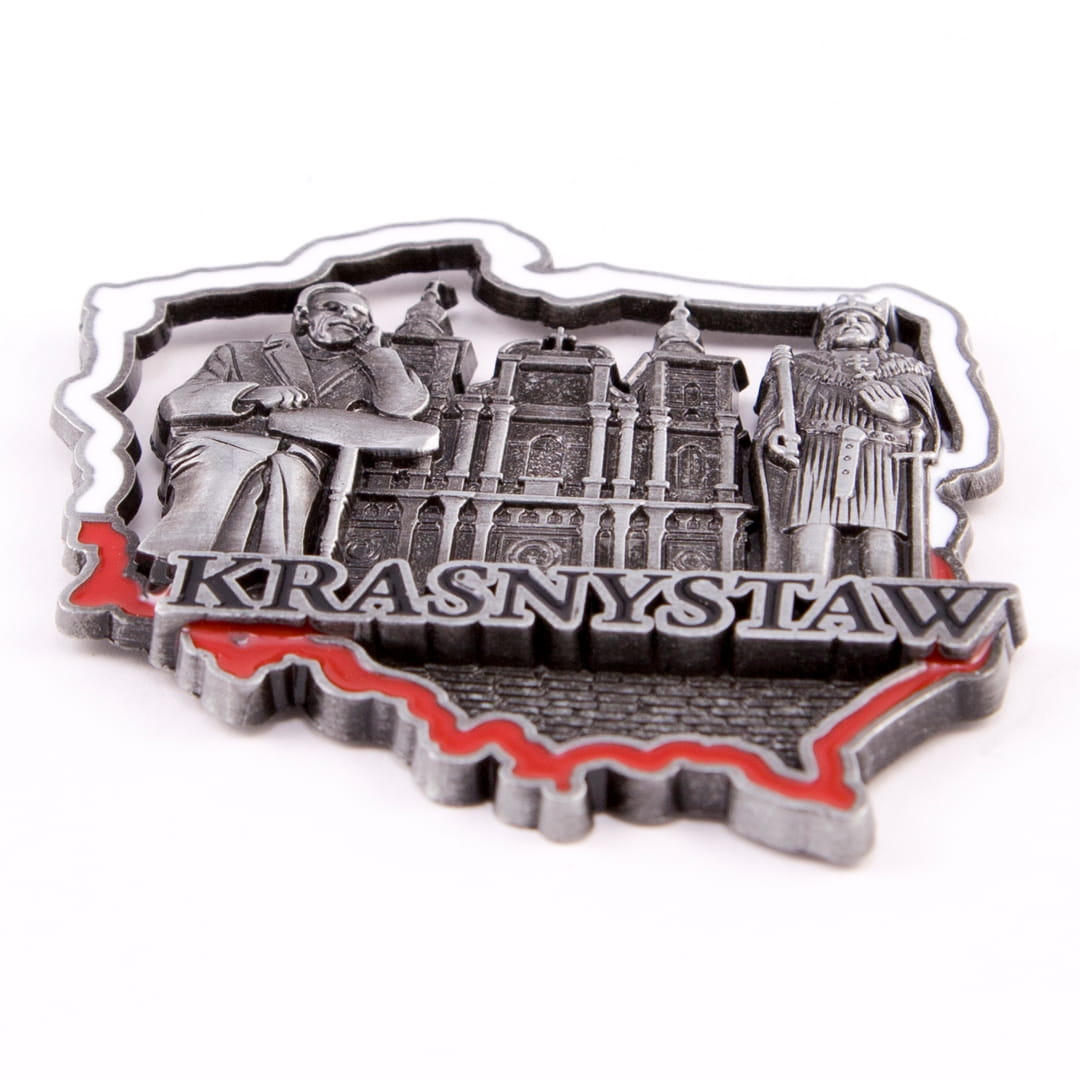 Metalowy, elegancki, bogato zdobiony, odlewany magnes w kształcie konturu Polski. W jej wnętrzu znajduje się między innymi Pomnik Króla Władysława Jagiełły, Parafia Świętego Franciszka Ksawerego oraz wyraźny napis "Krasnystaw". Kontur Polski pomalowany jest na biało-czerwono, napis na czarno, natomiast wnętrze mapy pozostawiono w kolorze antycznym srebrnym.
