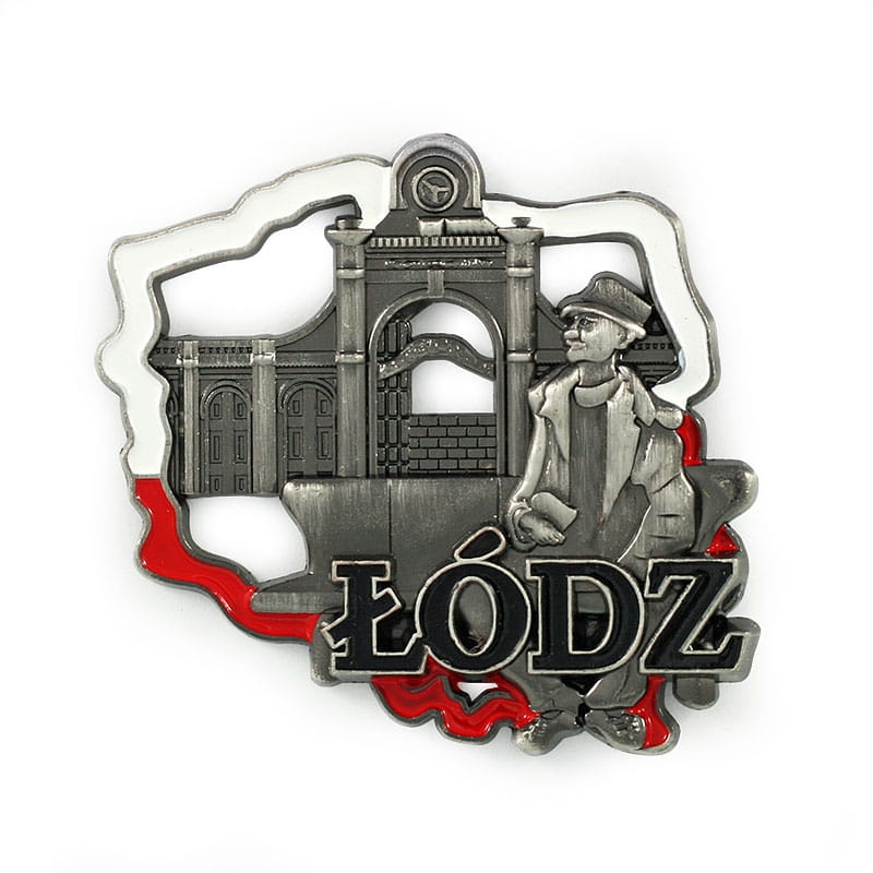 Metalowy magnes w kształcie konuturu Polski z wizerunkiem ławeczki Tuwima na Piotrkowskiej w Łodzi