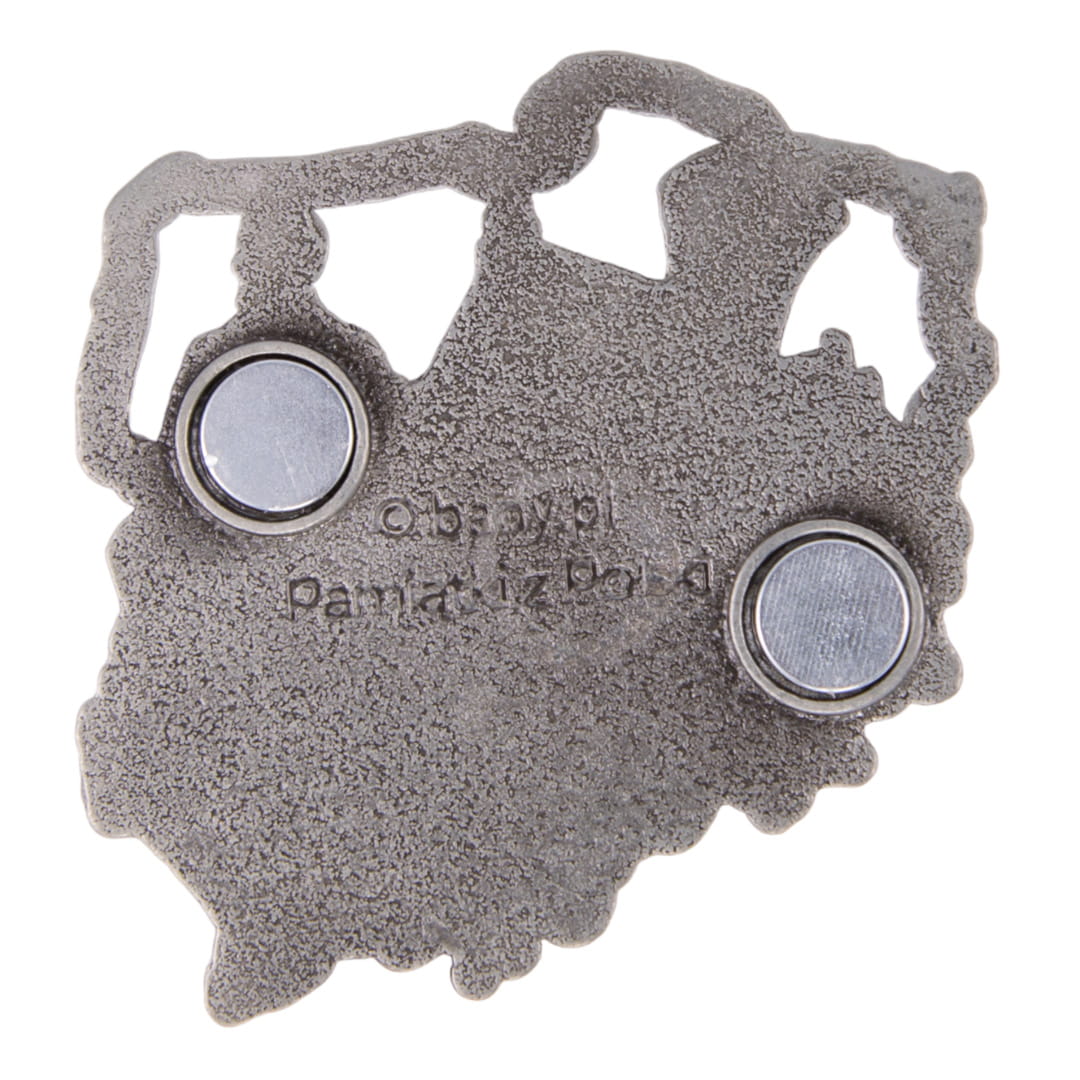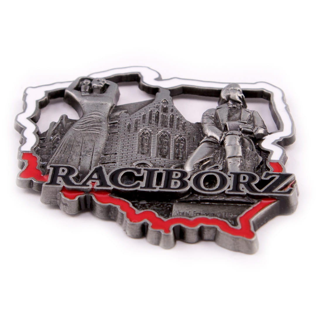 Metalowy, elegancki, bogato zdobiony, odlewany magnes w kształcie konturu Polski. W jej wnętrzu znajduje się między innymi pomnik Matki Polki, pomnik Josepha von Eichendorffa oraz duży, wyraźny napis "Racibórz". Kontur Polski pomalowany jest na biało-czerwono, napis na czarno, natomiast wnętrze mapy pozostawiono w kolorze antycznym srebrnym.
