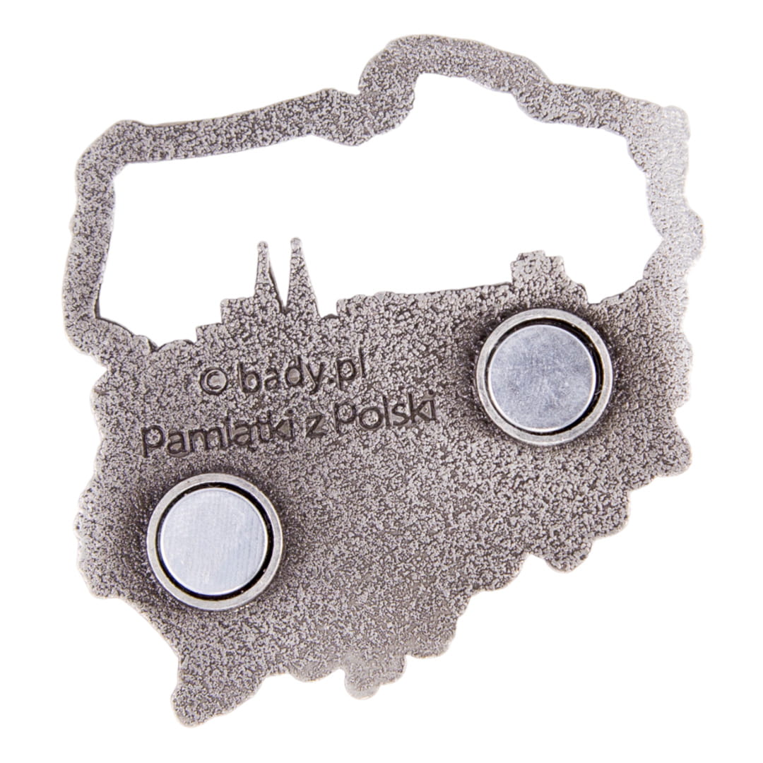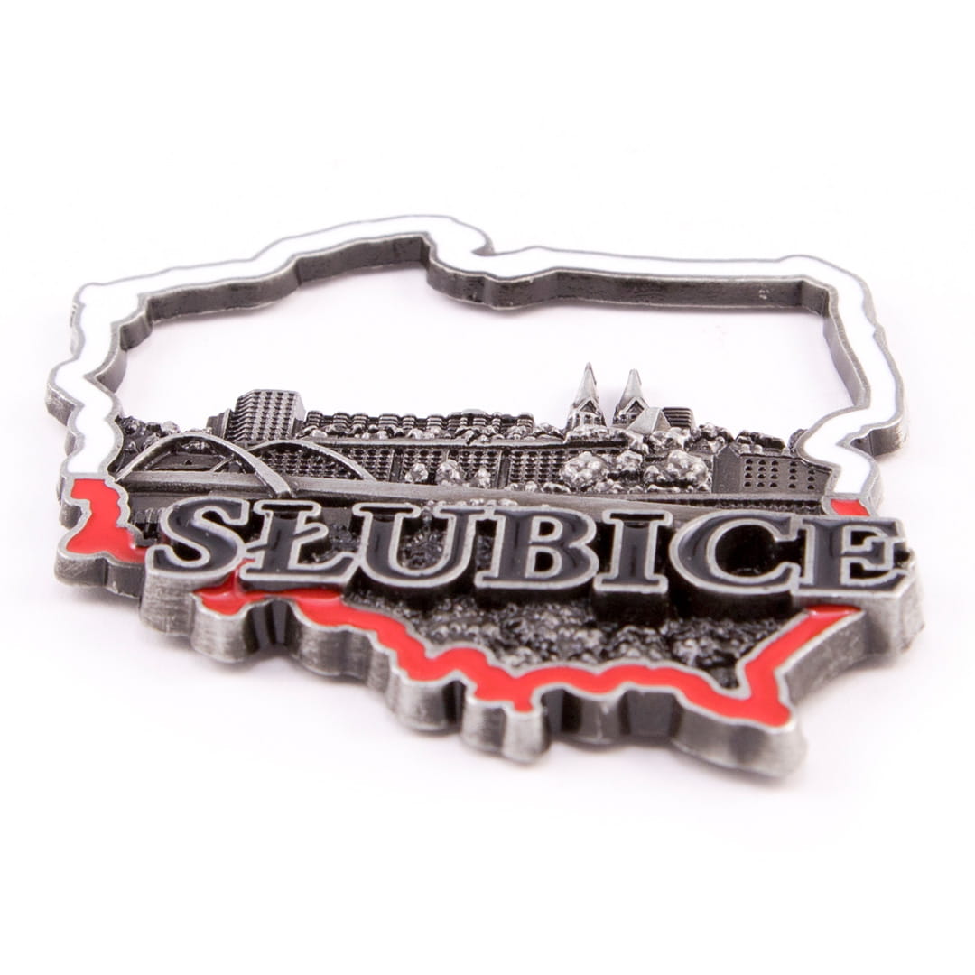 Metalowy, elegancki, bogato zdobiony odlewany magnes w kształcie konturu Polski. W jej wnętrzu znajduje się panorama miasta, most graniczny oraz duży, wyraźny napis "Słubice". Kontur pomalowany jest na biało-czerwono, napis na czarno, natomiast wnętrze mapy pozostawiono w kolorze antycznym srebrnym.