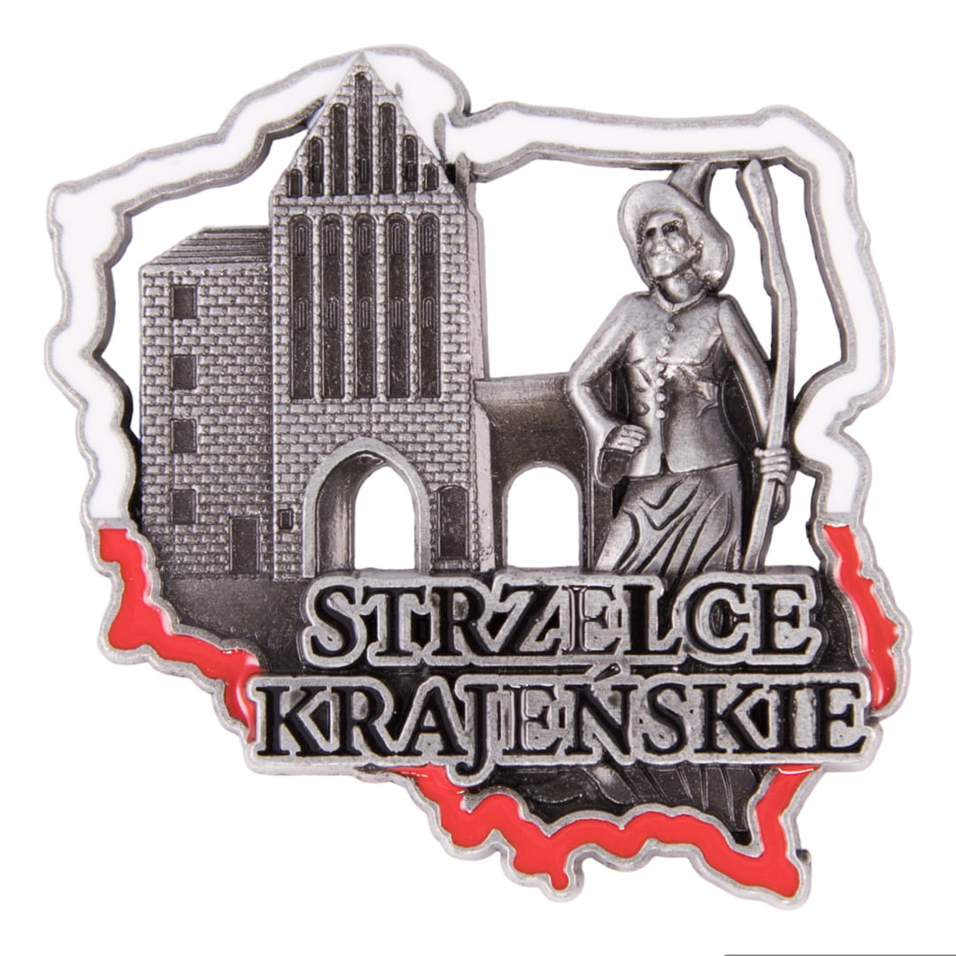 Metalowy, elegancki, bogato zdobiony, odlewany magnes w kształcie konturu Polski. W jej wnętrzu znajduje się Brama Młyńska, pomnik czarownicy oraz wyraźny napis "Strzelce Krajeńskie". Kontur Polski pomalowany jest na biało-czerwono, napis na czarno, natomiast wnętrze mapy pozostawiono w kolorze antycznym srebrnym.