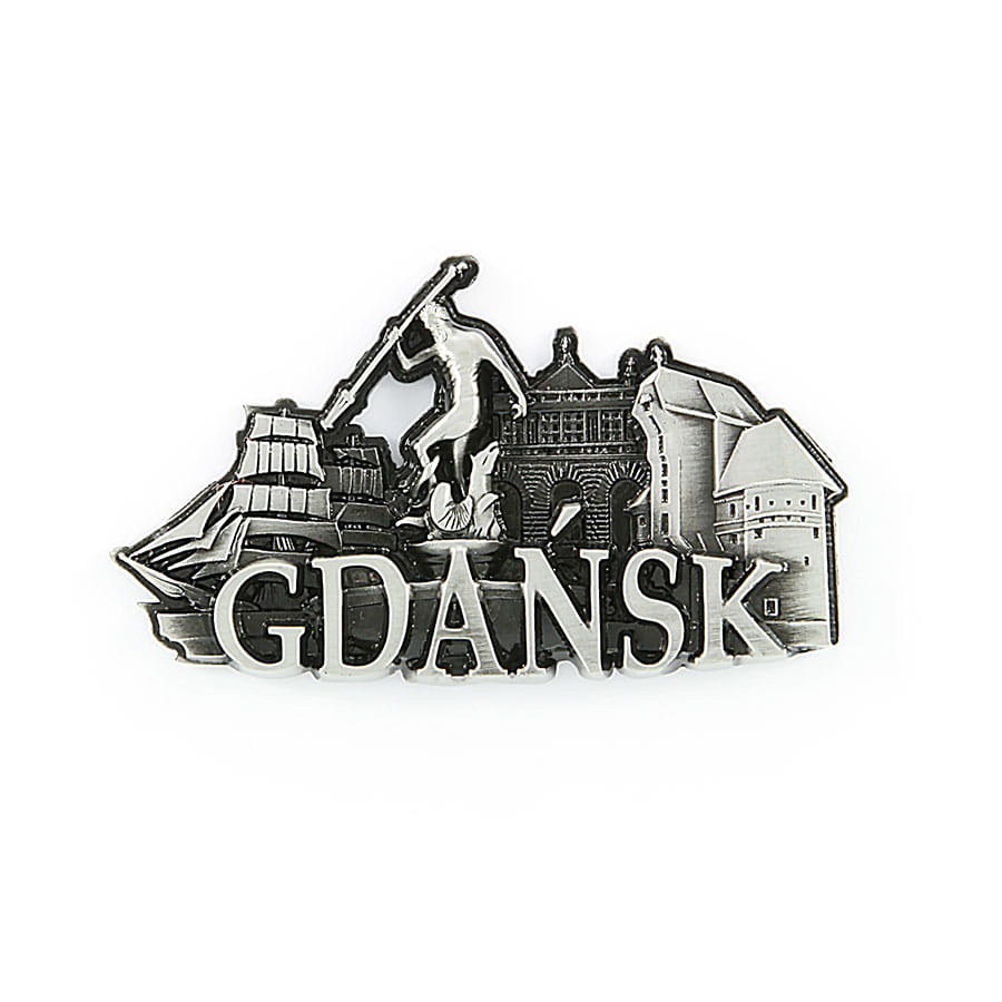 Metalowy magnes z napisem Gdańsk, przedstawiający zabytki tego miasta: Żuraw, fontanna z Neptunem, Dwór Artusa.