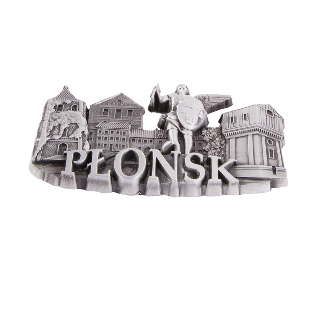 Metalowy, bogato zdobiony, żłobiony magnes z napisem "Płońsk", przedstawiający najpopularniejsze zabytki i atrakcje miasta. Wśród nich między innymi: rzeźba św. Michała Archanioła i Późnogotycki kościół p.w. Św. Michała Archanioła.