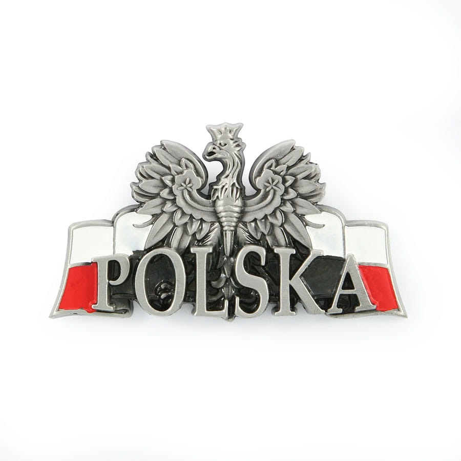 Metalowy magnes z napisem Polska, przedstawiający polskiego orła na tle biało-czerwonej flagi.