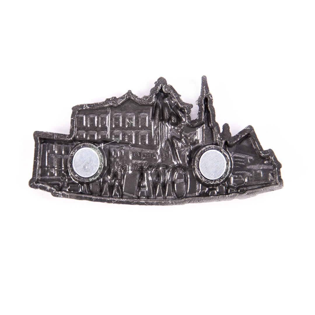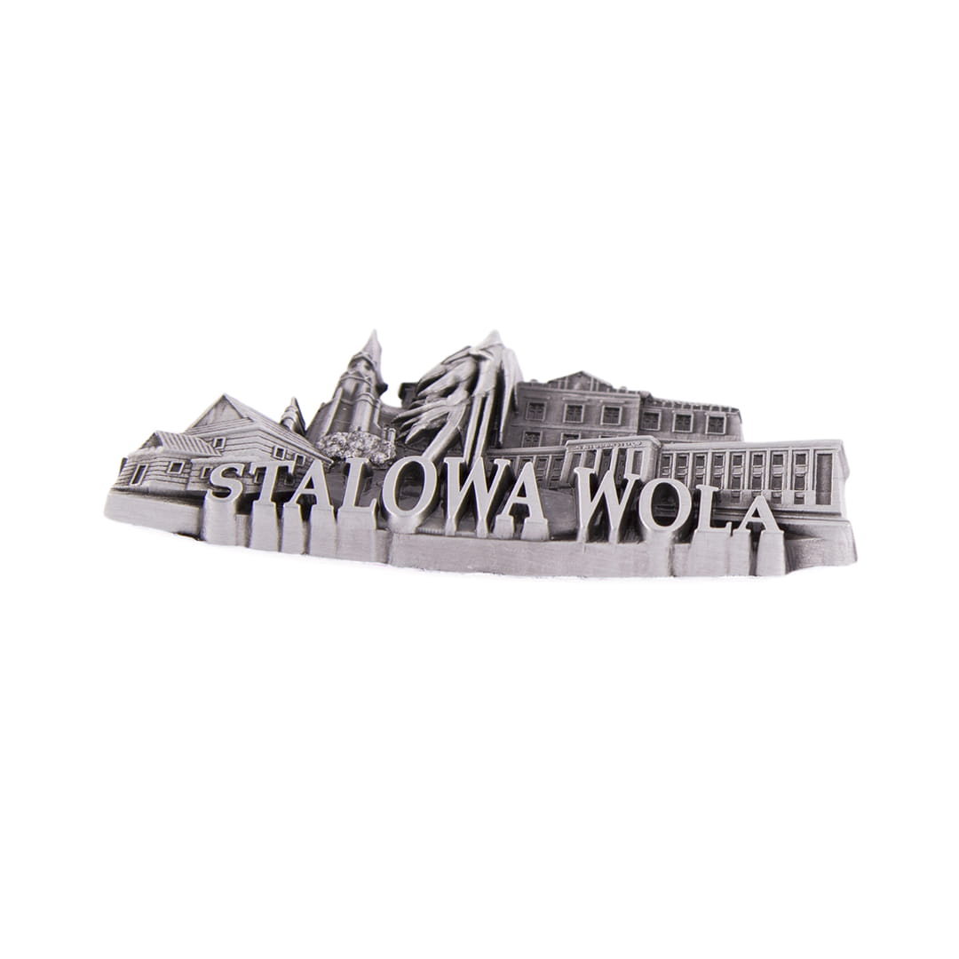 Metalowy, bogato zdobiony, żłobiony magnes z napisem "Stalowa Wola", przedstawiający najpopularniejsze zabytki i atrakcje miasta. Wśród nich między innymi: Miejski Dom Kultury i kościół św. Floriana. Mocowanie stanowią dwa niewielkie, ale silne magnesy zapewniające trwałe przyczepienie do metalowej powierzchni.