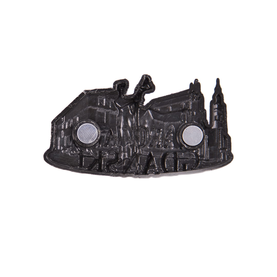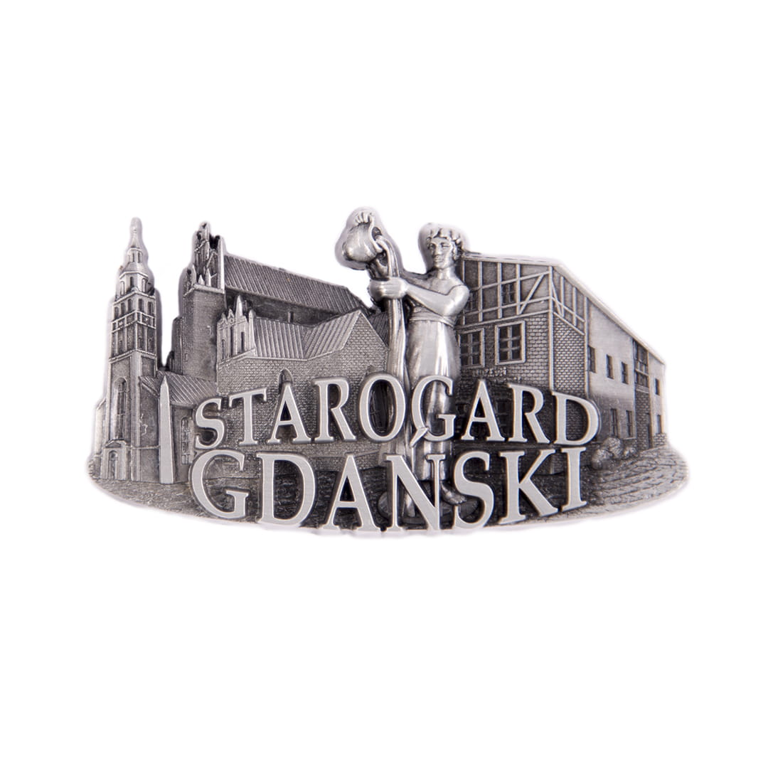 Metalowy, bogato zdobiony, żłobiony magnes z napisem "Starogard Gdański", przedstawiający najpopularniejsze zabytki i atrakcje miasta. Wśród nich między innymi: Parafia pw. Świętego Mateusza i Wierzyczanka.