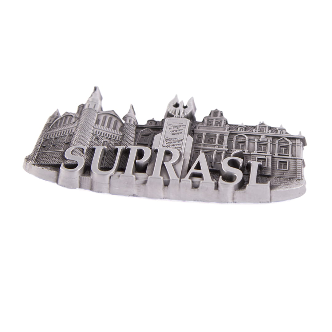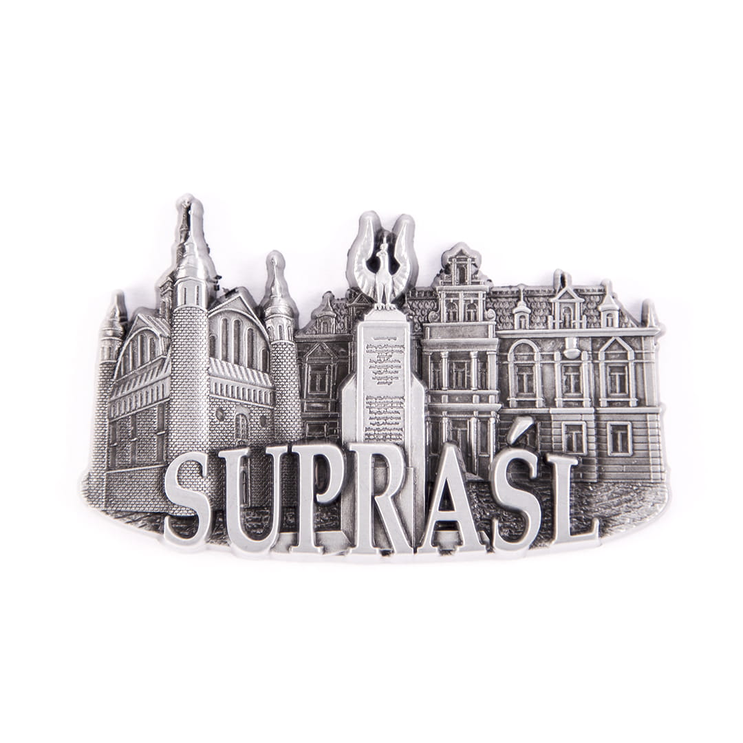 Metalowy, bogato zdobiony, żłobiony magnes z napisem "Supraśl", przedstawiający najpopularniejsze zabytki i atrakcje miasta. Wśród nich między innymi: pałac Buchholtzów i pomnik Zwycięstw Nad Rosją Sowiecką. Mocowanie stanowią dwa niewielkie, ale silne magnesy zapewniające trwałe przyczepienie do metalowej powierzchni.