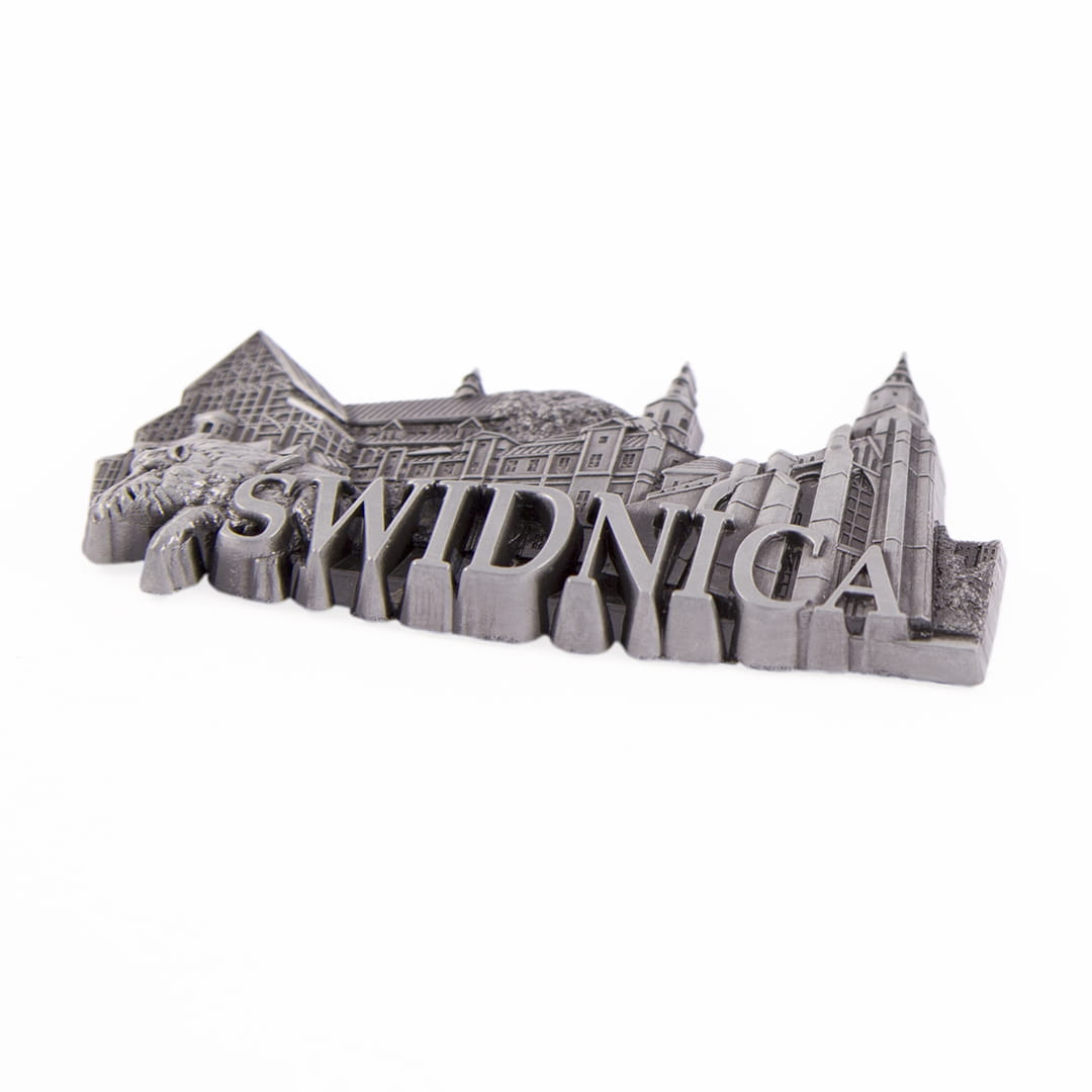 Metalowy, bogato zdobiony, żłobiony magnes z napisem "Świdnica", przedstawiający najpopularniejsze zabytki i atrakcje miasta. Wśród nich między innymi: Luterański Kościół Pokoju i ratusz. Mocowanie stanowią dwa niewielkie, ale silne magnesy zapewniające trwałe przyczepienie do metalowej powierzchni.