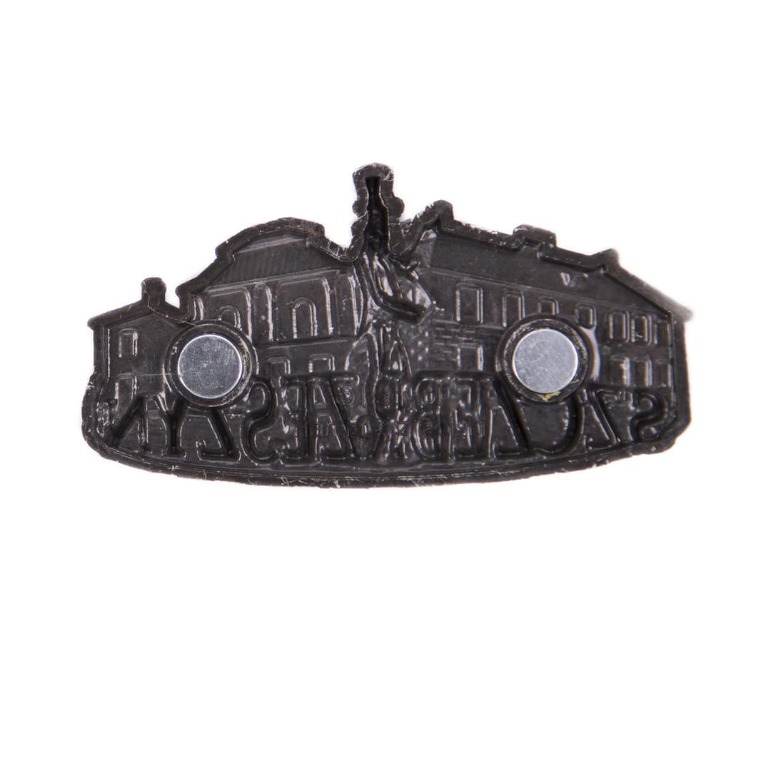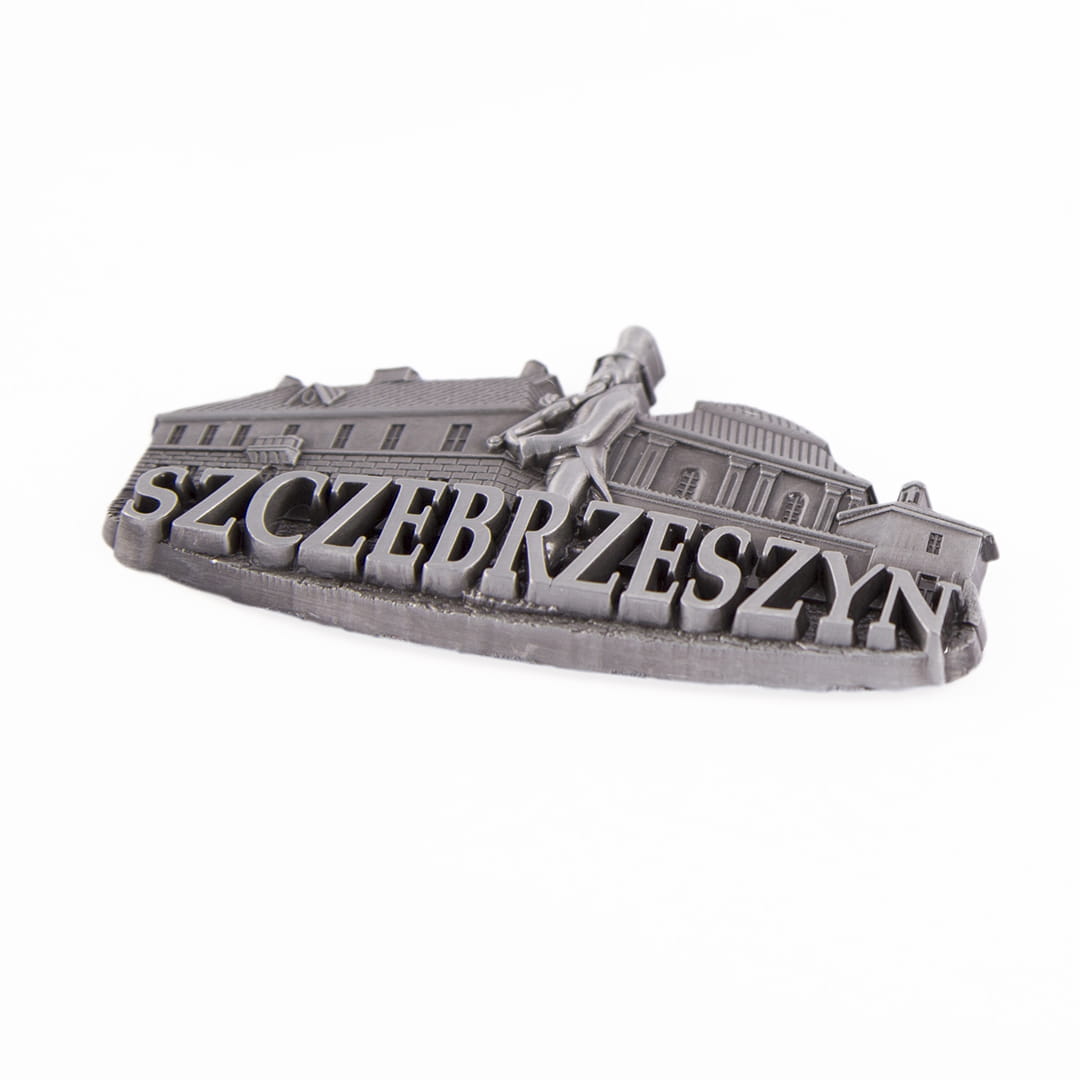 Metalowy, bogato zdobiony, żłobiony magnes z napisem "Szczebrzeszyn", przedstawiający najpopularniejsze zabytki i atrakcje miasta. Wśród nich między innymi: pomnik chrząszcza i synagoga. Mocowanie stanowią dwa niewielkie, ale silne magnesy zapewniające trwałe przyczepienie do metalowej powierzchni.