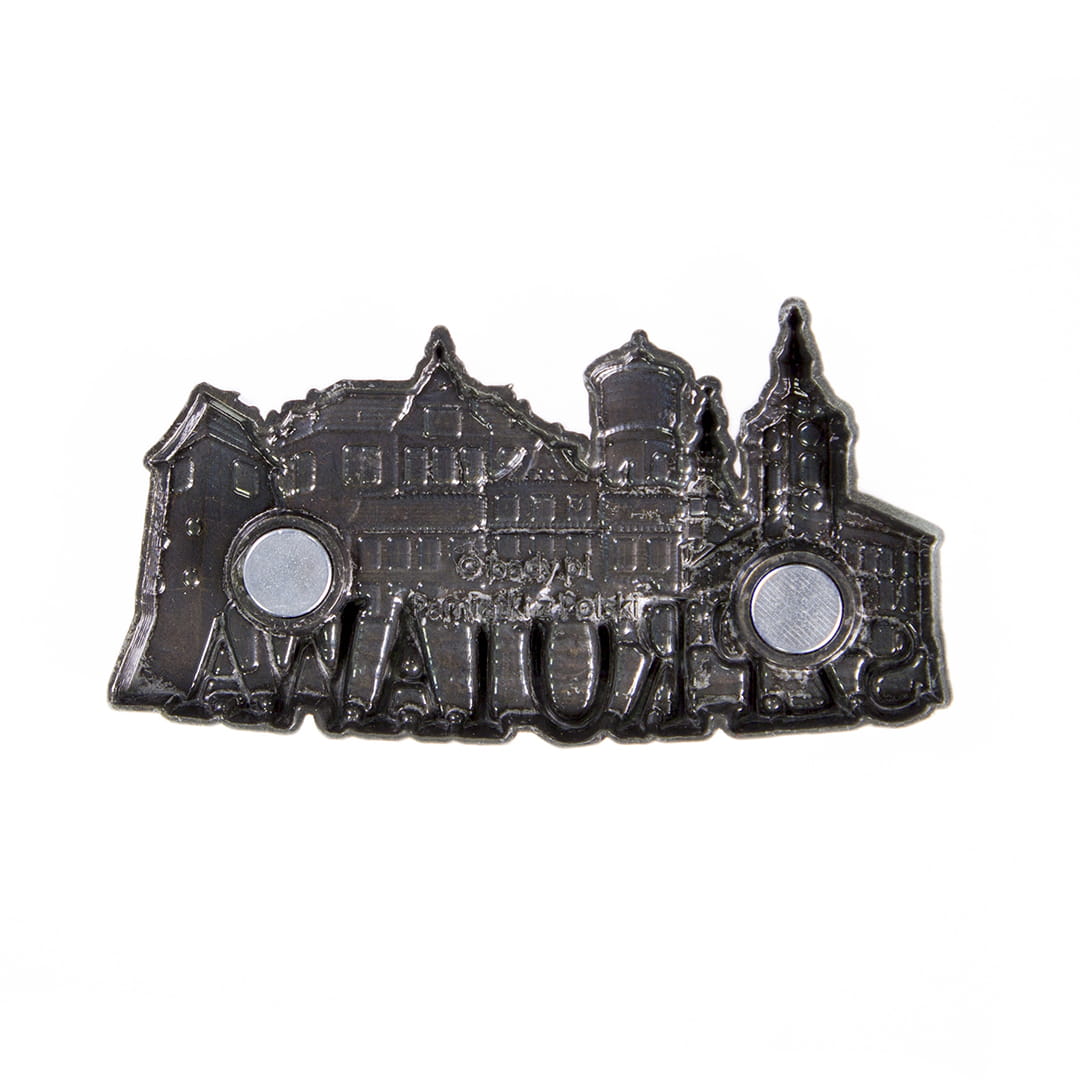 Metalowy, bogato zdobiony, żłobiony magnes z napisem "Szprotawa", przedstawiający najpopularniejsze zabytki i atrakcje miasta. Wśród nich między innymi: ratusz i wieża ciśnień. Mocowanie stanowią dwa niewielkie, ale silne magnesy zapewniające trwałe przyczepienie do metalowej powierzchni.