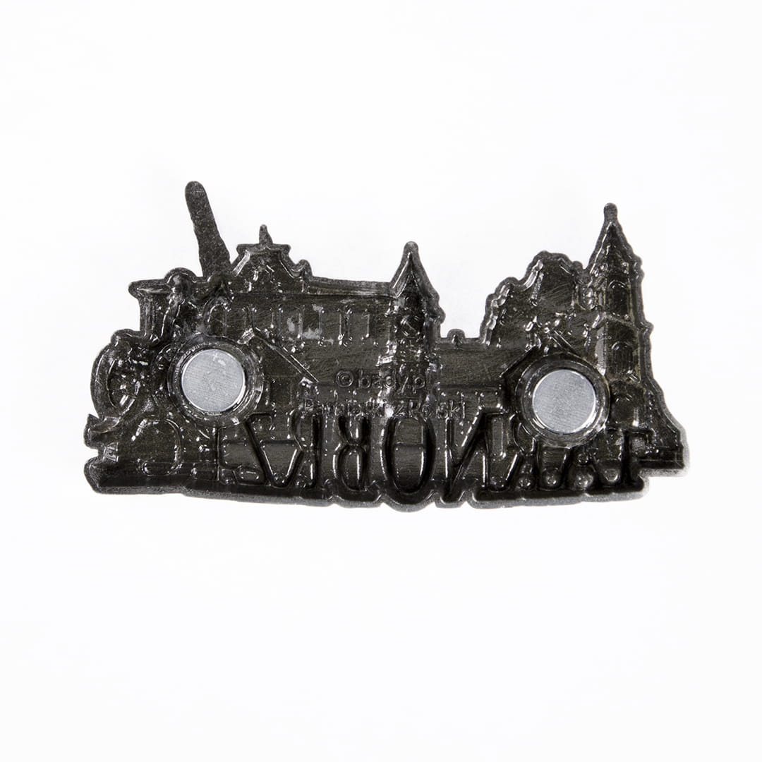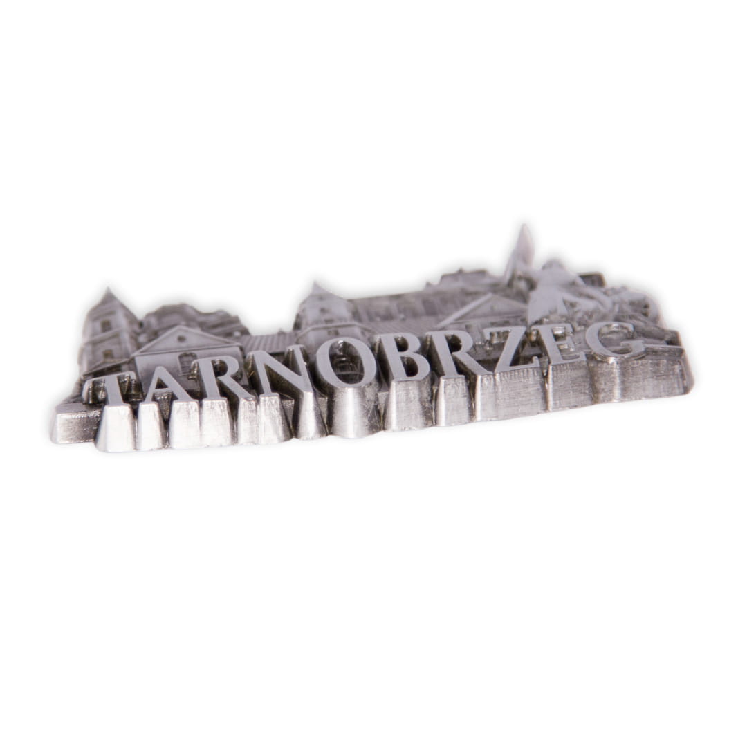 Metalowy, bogato zdobiony, żłobiony magnes z napisem "Tarnobrzeg", przedstawiający najpopularniejsze zabytki i atrakcje miasta. Wśród nich między innymi: pomnik Bartosza Głowackiego i Klasztor Dominikanów. Mocowanie stanowią dwa niewielkie, ale silne magnesy zapewniające trwałe przyczepienie do metalowej powierzchni.