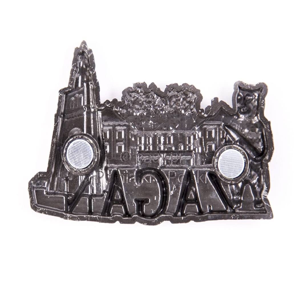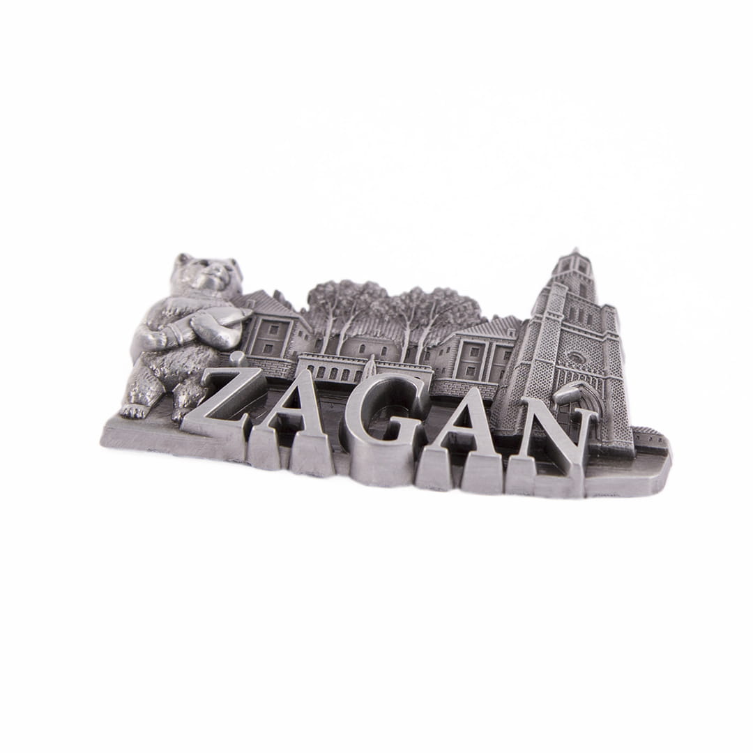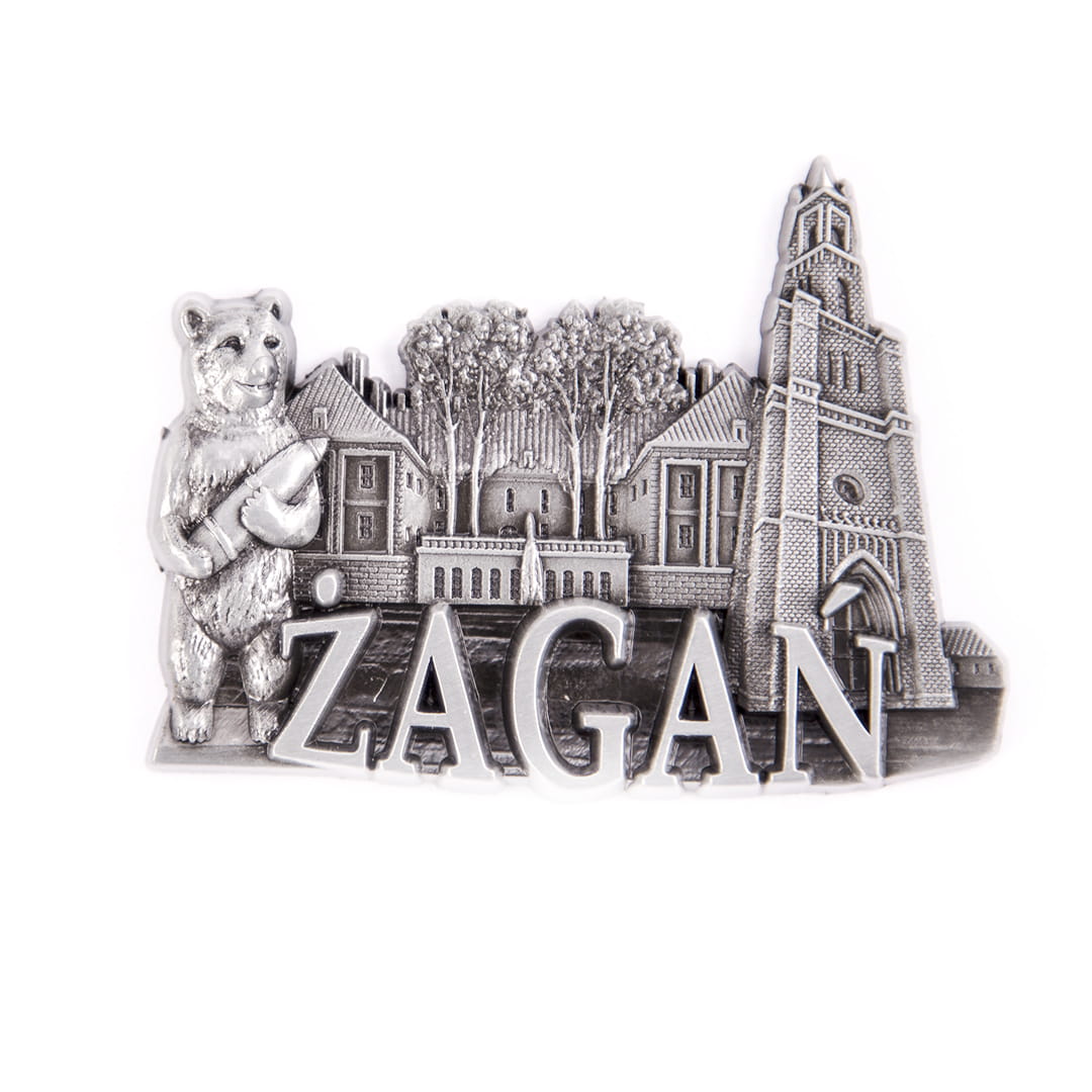 Metalowy, bogato zdobiony, żłobiony magnes z napisem "Żagań", przedstawiający najpopularniejsze zabytki i atrakcje miasta. Wśród nich między innymi: pomnik misia Wojtka i Kościół Łaski. Mocowanie stanowią dwa niewielkie, ale silne magnesy zapewniające trwałe przyczepienie do metalowej powierzchni.