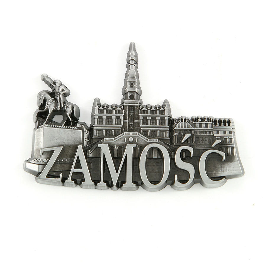 Metalowy magnes na lodówkę z napisem Zamość,przedstawiający najpopularniejsze zabytki miasta.
