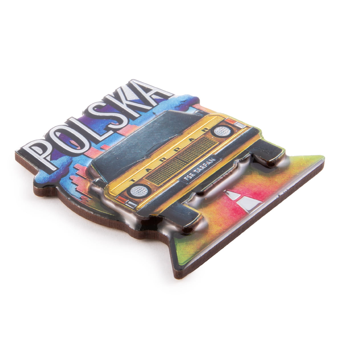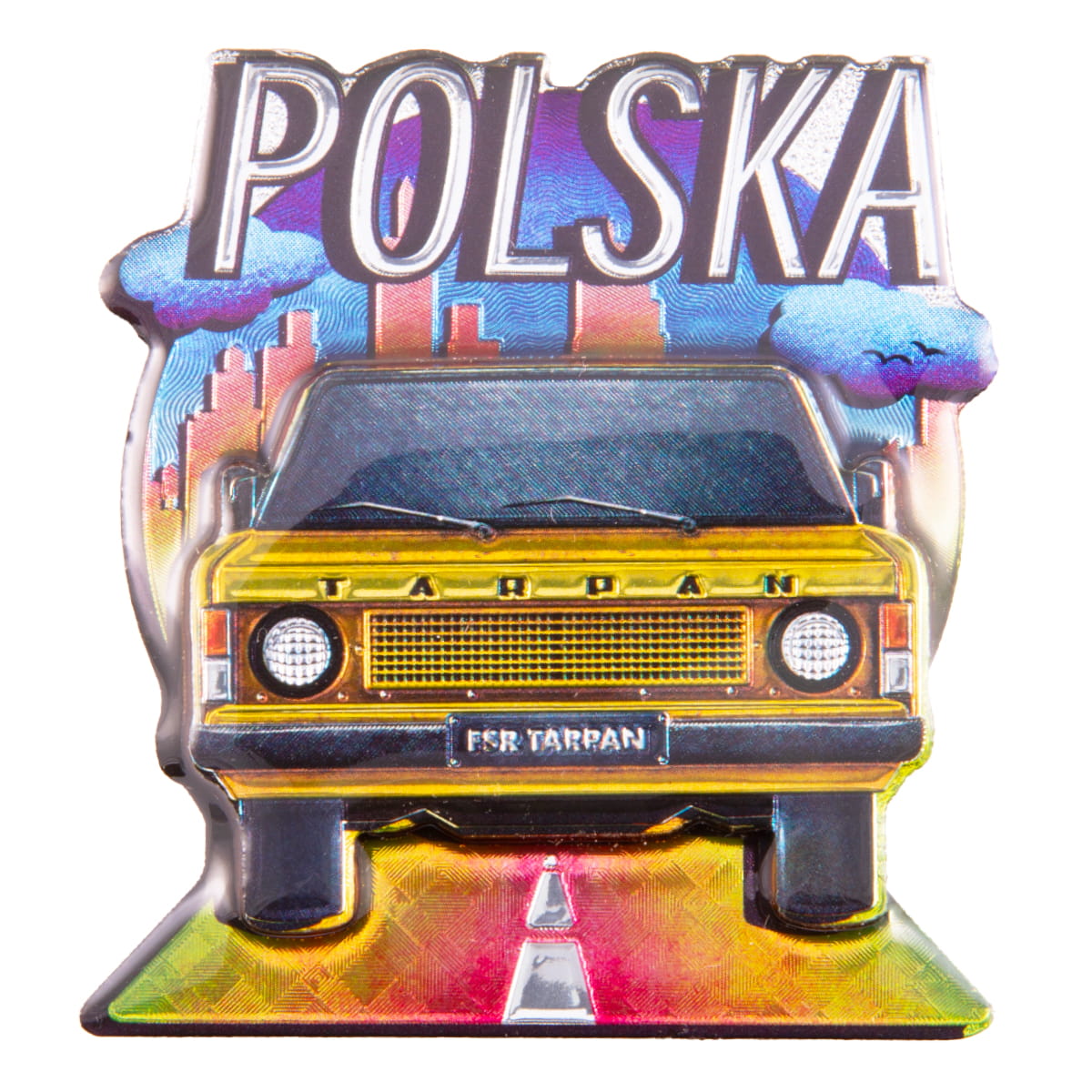 Wykonany z MDF, dwuwarstwowy, barwny magnes metalizowany, przedstawiający żółty samochód marki FSR Tarpan - jest to element kolekcji "Klasyki Polskich Dróg". Nad samochodem widnieje duży, wyraźny napis "Polska". Cały front magnesu zalany jest żywicą epoksydową zapewniającą trwałość kolorów i nadającą połysk. Na rewersie pamiątki znajduje się duża taśma magnetyczna.