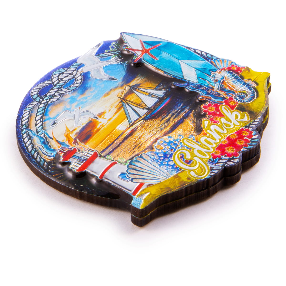 Wykonany z MDF dwuwarstwowy magnes metalizowany, przedstawiający nadmorską panoramę. Wśród prezentowanych na magnesie elementów zauważyć można między innymi żaglowiec, deska surfingowa i latarnia morska. Widoczny jest na nim też wyraźny napis "Gdańsk". Front magnesu zalany jest żywicą epoksydową zapewniającą trwałość kolorów i nadającą połysk. Na rewersie umieszczona jest duża, wysokiej klasy taśma magnetyczna zapewniająca trwałe, bezpieczne umocowanie pamiątki na metalowej powierzchni.