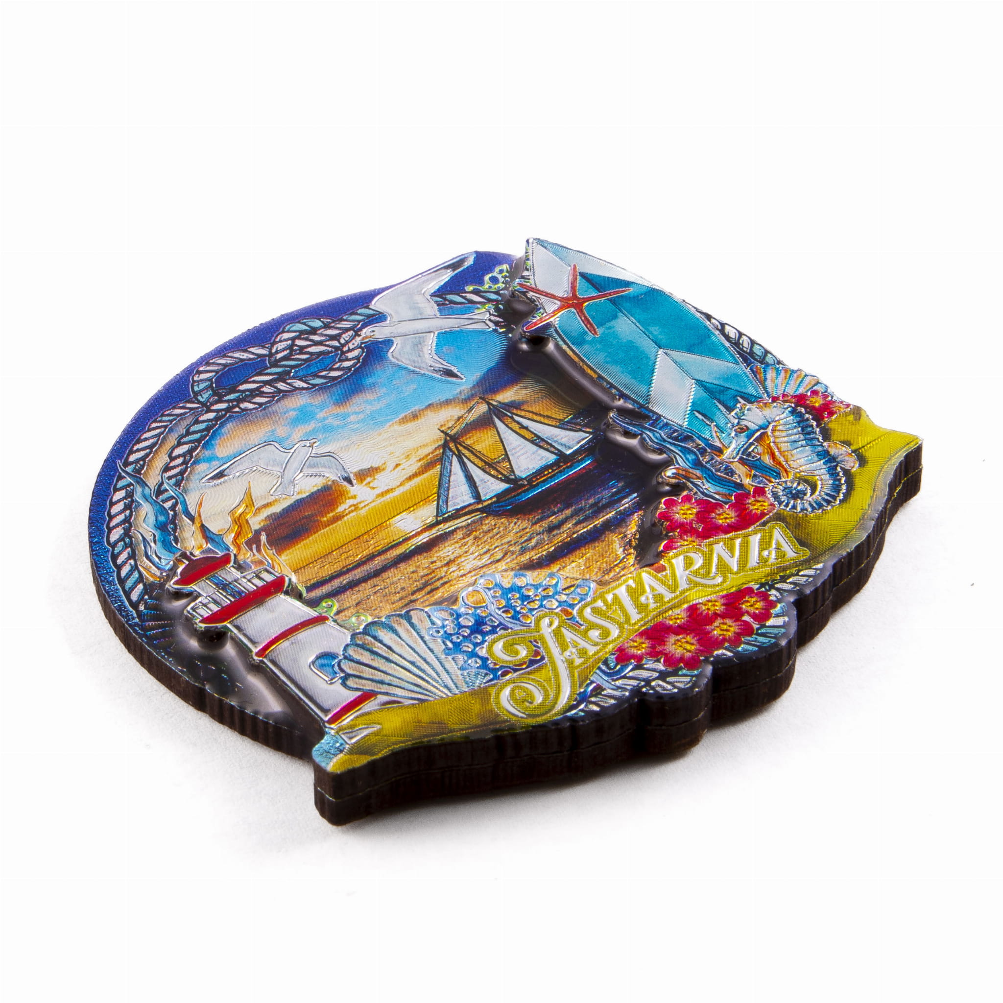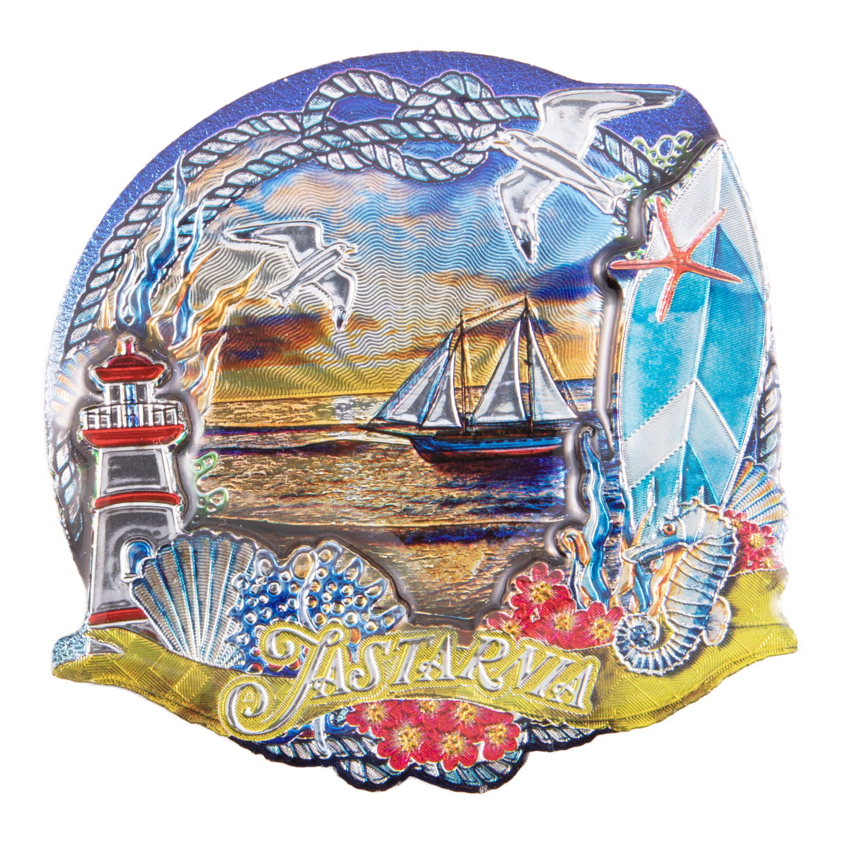 Wykonany z MDF dwuwarstwowy magnes metalizowany, przedstawiający nadmorską panoramę. Wśród prezentowanych na magnesie elementów zauważyć można między innymi żaglowiec, deska surfingowa i latarnia morska. Widoczny jest na nim też wyraźny napis "Jastarnia". Front magnesu zalany jest żywicą epoksydową zapewniającą trwałość kolorów i nadającą połysk. Na rewersie umieszczona jest duża, wysokiej klasy taśma magnetyczna zapewniająca trwałe, bezpieczne umocowanie pamiątki na metalowej powierzchni.